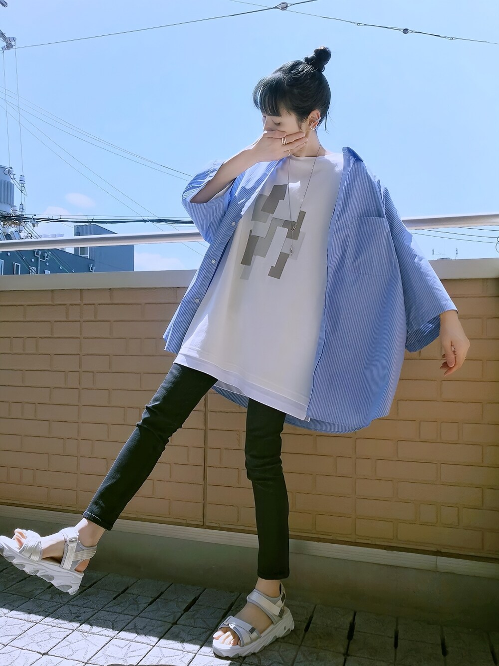 プリントT×シャツ GUの五分袖ストライプシャツは元々オーバーサイズなのを更にオーバーサイズでゆるっと抜き襟で羽織り プリントTはGUのドライタンクでレイヤード メロンミルク(小窓) コストコに買い物に行った時に朝昼食べ逃して何食べたらいいか分からなくなって夕張メロンと北海道ミルクMIXのソフトクリームですませてしまった( ˙³˙)