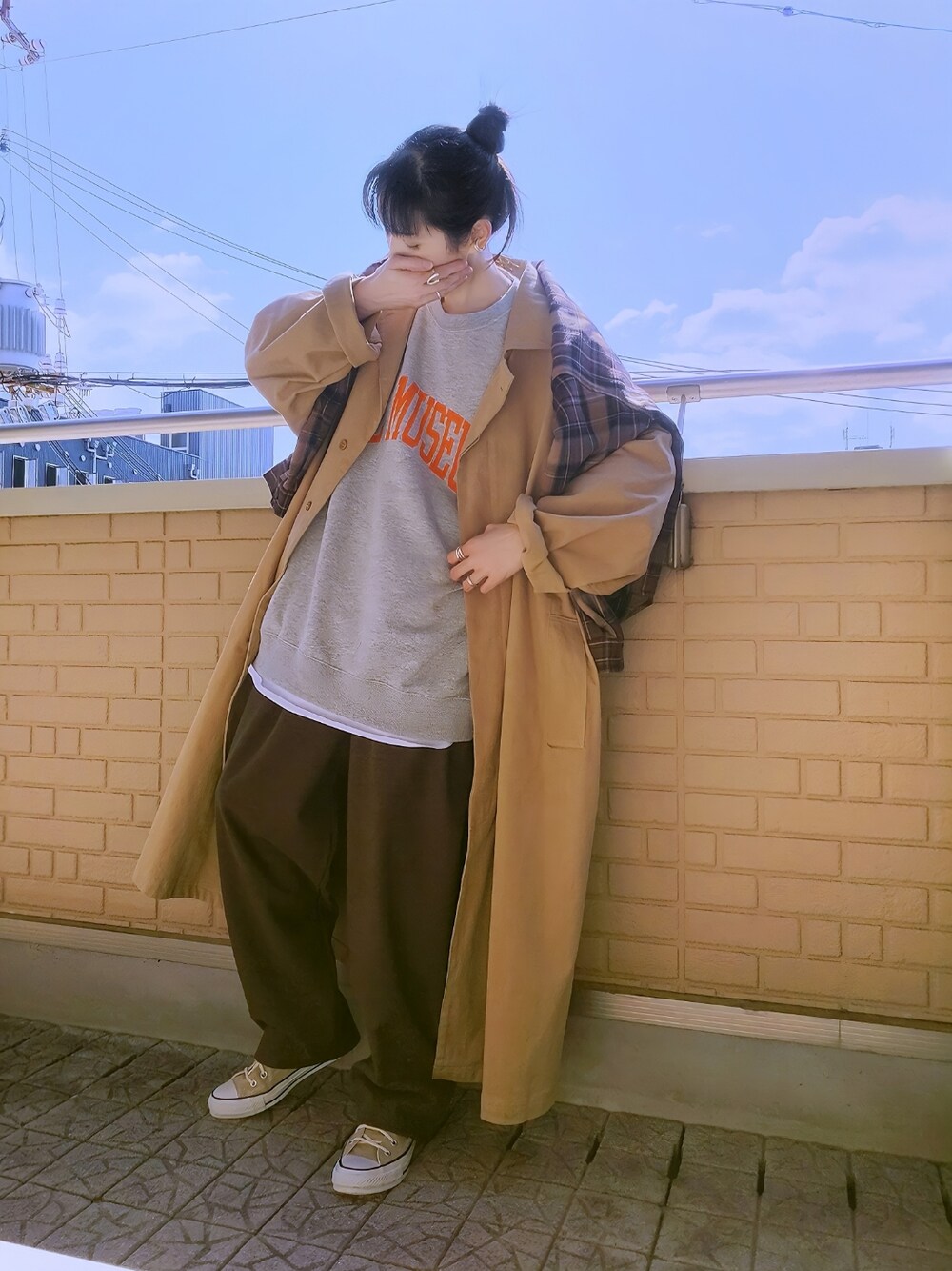 チェスターコート×チェックシャツ オレンジのカレッジロゴスウェットは白Tとレイヤード マキシ丈のチェスターコートはルーズに腕まくり+チェックのシャツをゆるっと肩掛け シャツに合わせてワイドなシルエットのテーパードパンツもブラウン合わせ コラボ(小窓) セブンで売ってたコラボスィーツ ドラマ「恋です!~ヤンキー君と白杖ガール」の中でポップコーンが食べたいけど食べるのを遠慮していた弱視の女の子の為にカフェの店長が作ったポップコーンが乗ったパフェを再現してるんだけど··· 後のせでカリカリなキャラメルポップコーンとコーヒーゼリーがウマっ(๑ت๑)♪