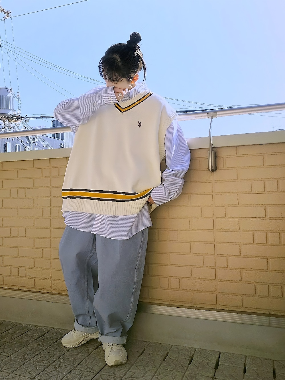 ベスト×ストラップシャツ オーバーサイズのGUのカーブタックパンツに古着で見つけたNAUTICAのストラップシャツにイエローのラインが差し色のベストをレイヤード シンプルに春っぽくフレッピースタイル Thanks(小窓) いつもコメントをくれてるまぽゆとさんの息子くん-ゆと君が私のコーデを真似っこぉぉおあぁぁ----可愛い!! はにかんだ笑顔が可愛すぎる!!グミいっぱい買ってあげたい!!!尊いぃ···(´ ˘ `♡)