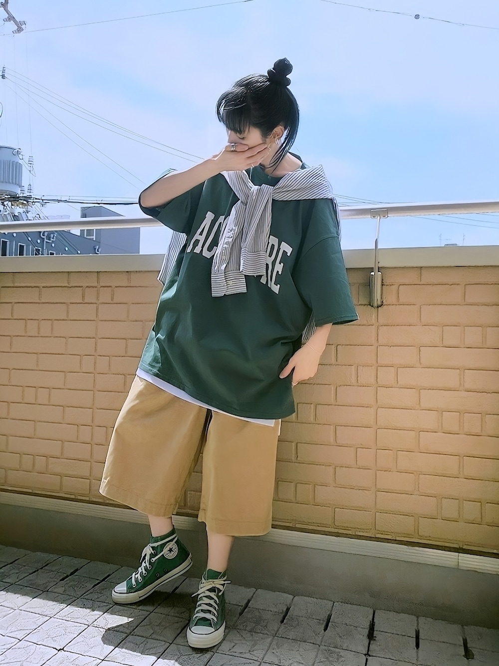 ロゴTシャツ×ハーフパンツ ワイドシルエットのハーフチノパンにグリーンのロゴTは白タンクとレイヤード 肩掛けした古着のNAUTICAのストライプシャツ+コンバースはTシャツに合わせてグリーン FUJI ROCK FESTIVAL(小窓) 3年振りの前夜祭を経て今日からスタート!フジロック!! 今年もYouTubeで配信するみたいだけど今年はガッツリ仕事してるから夜はスマホかPCで絶対見るぞー٩(๑•ㅂ•)۶