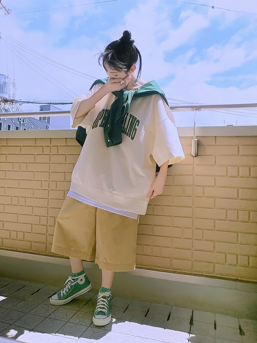 ロゴT×肩掛けシャツ ワイドシルエットのハーフチノパンにGUのグリーンロゴTは白タンクとレイヤードして秋物のツイルオーバーサイズシャツはゆるっと肩掛け Tシャツのロゴとシャツに合わせて足元もグリーンのコンバース合わせ 能登ミルク(小窓) 帰省→実家到着から数時間後には能登の加賀屋へ··· チェックインにはちょっと早かったので姉が行きたがっていた能登ミルクへ 炎天下にも関わらずめちゃくちゃ並んでたけどお疲れな男性陣は放置で女性陣だけで並びながらお店の周りや可愛い店内の写真を撮ってたらあっという間に順番がw 塩レモン×宙(ミックス)美味しかった(*´ェ`*)