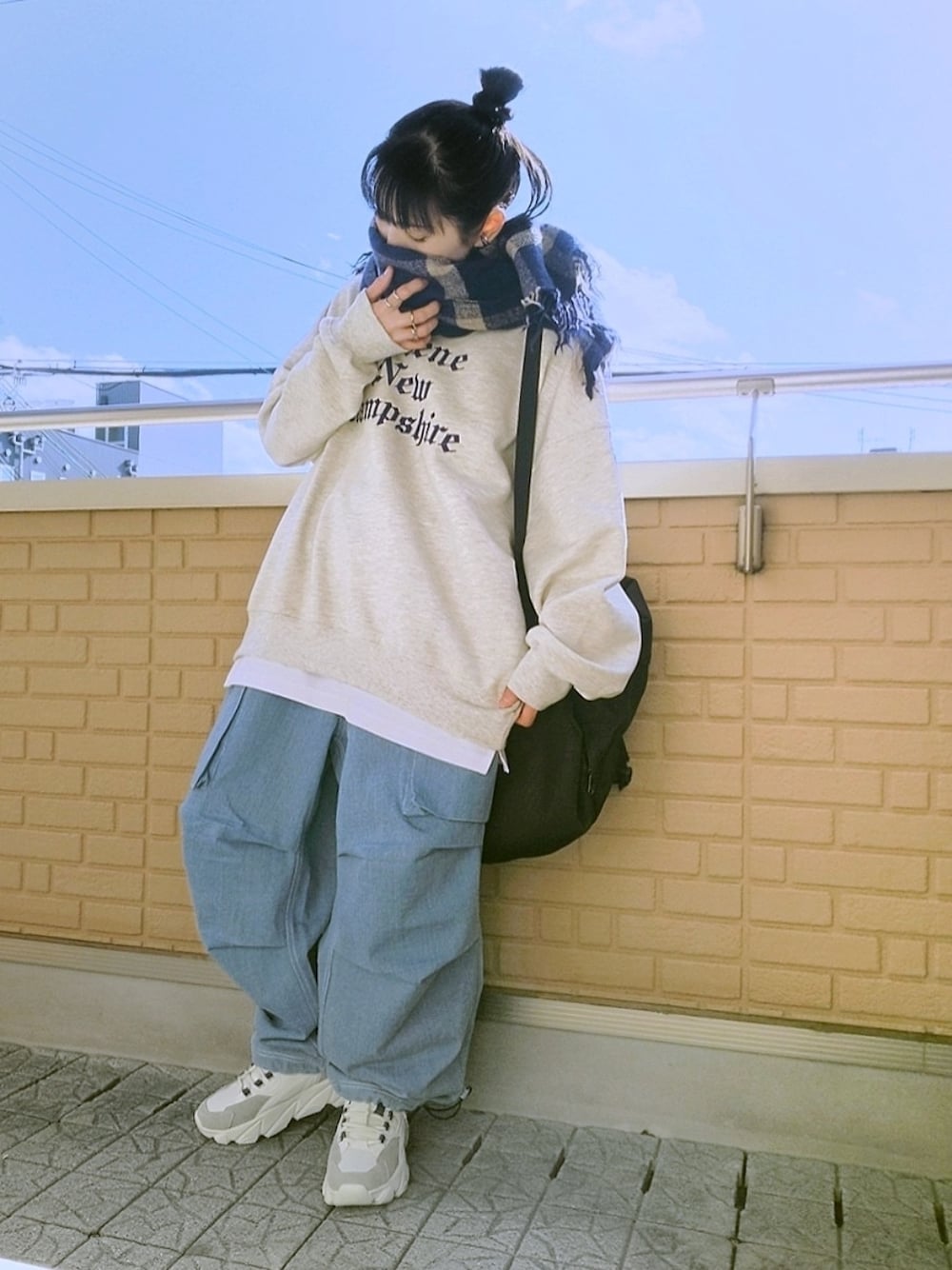 スウェット×カーゴパンツ これからの季節にいっぱい使えそうなブルー系のワイドカーゴパンツにビッグシルエットのロゴスウェットは白Tとレイヤードしてネイビーのチェックマフラーをぐるっと巻き glasses(小窓) お仕事を始めてから夜になると軽く頭痛が··· その原因がどうやら視力の低下だったようで、ついにメガネを作ってしまいました:( ;´꒳`;): 仕事の時だけかけているので普段はあんまり使ってないんですが、まだまだ慣れなくて逆に目が疲れてるw