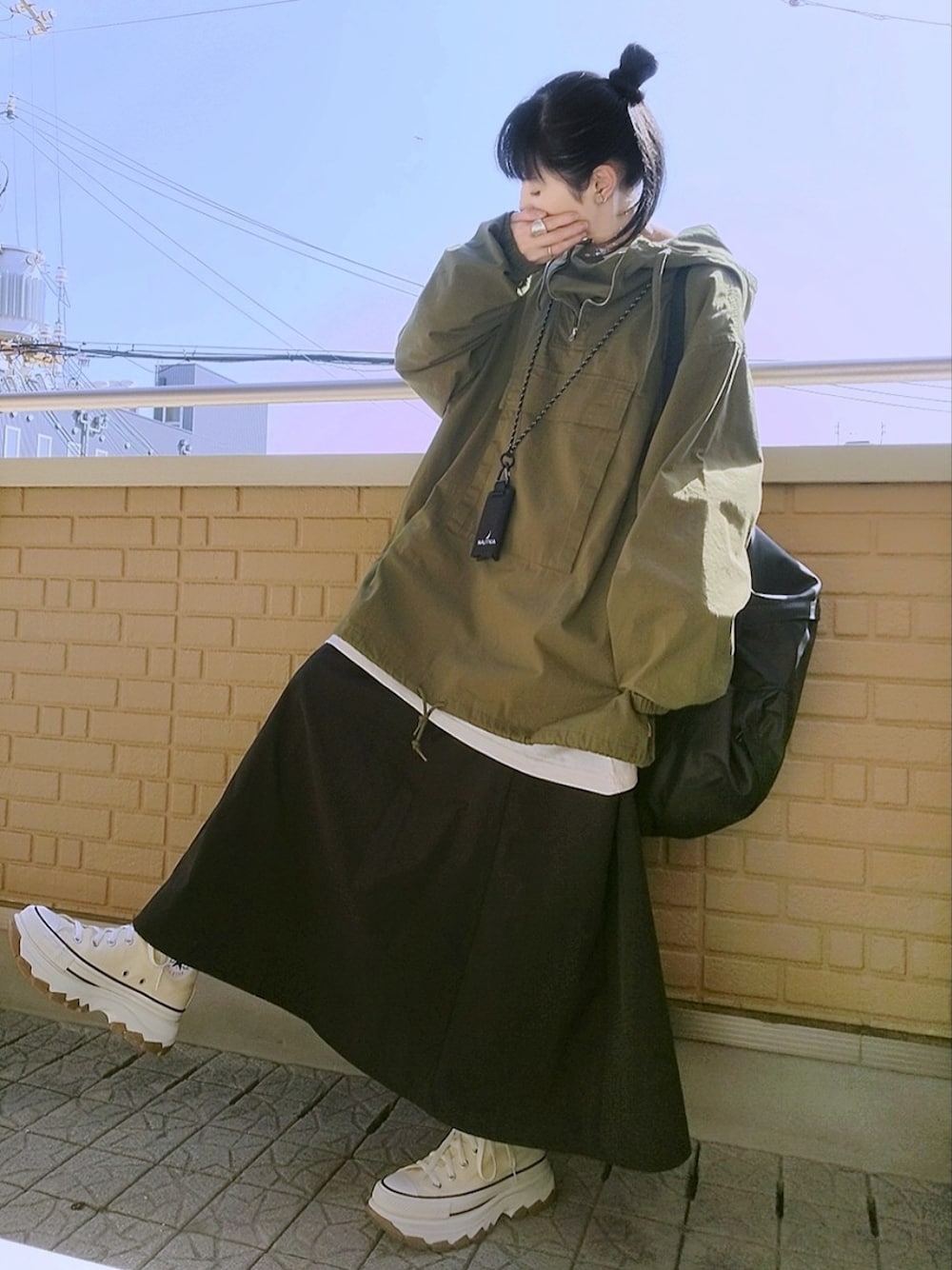 ハーフジップパーカー×スカート 大きなポケットが付いたシャカシャカ生地のフレアスカートに白Tとレイヤードしてるのはヴィンテージミリタリー仕様なハーフジップのアノラックパーカー 全体のバランスに合わせてバックパックもコンバースも大きめ&ごつめなシルエット