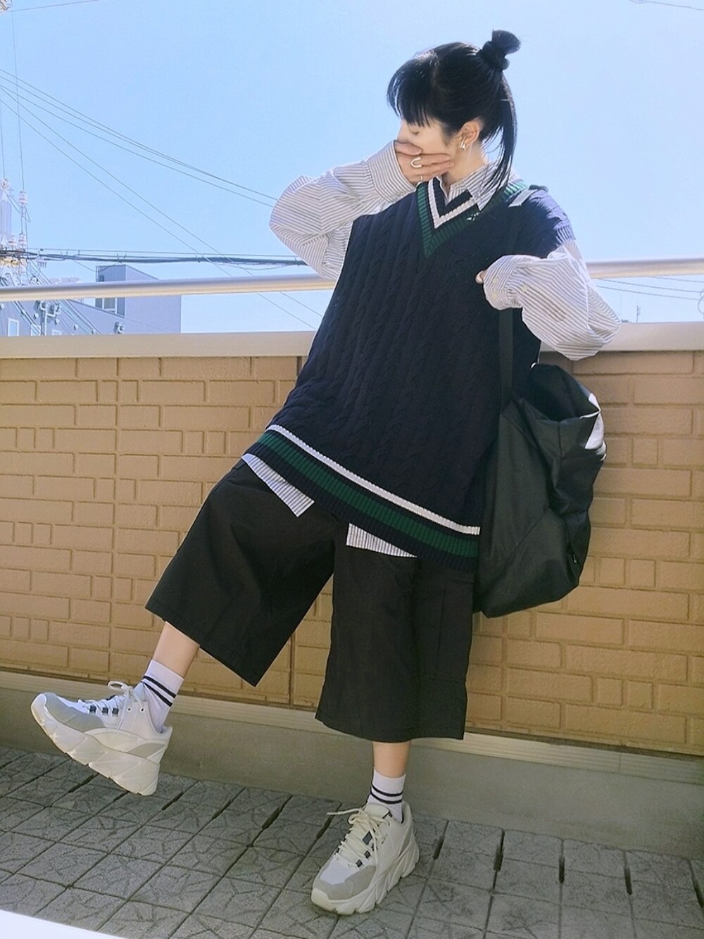 ベスト×ストライプシャツ カーゴハーフパンツはオーバーサイズでゆる感+ 色違い&サイズ違いで購入したUNIQLOのクリケットロングベストに古着のNAUTICAストライプシャツとレイヤード ラインソックス+バックパックでゆるトラッド風スタイル lenlen23(小窓) @lenlen23こと、きょうちゃんの息子くんが追いコーデしてくれました♪ もう悶絶するぐらいに可愛い真似っこコーデにニヤニヤが止まりません(*´ェ`*)