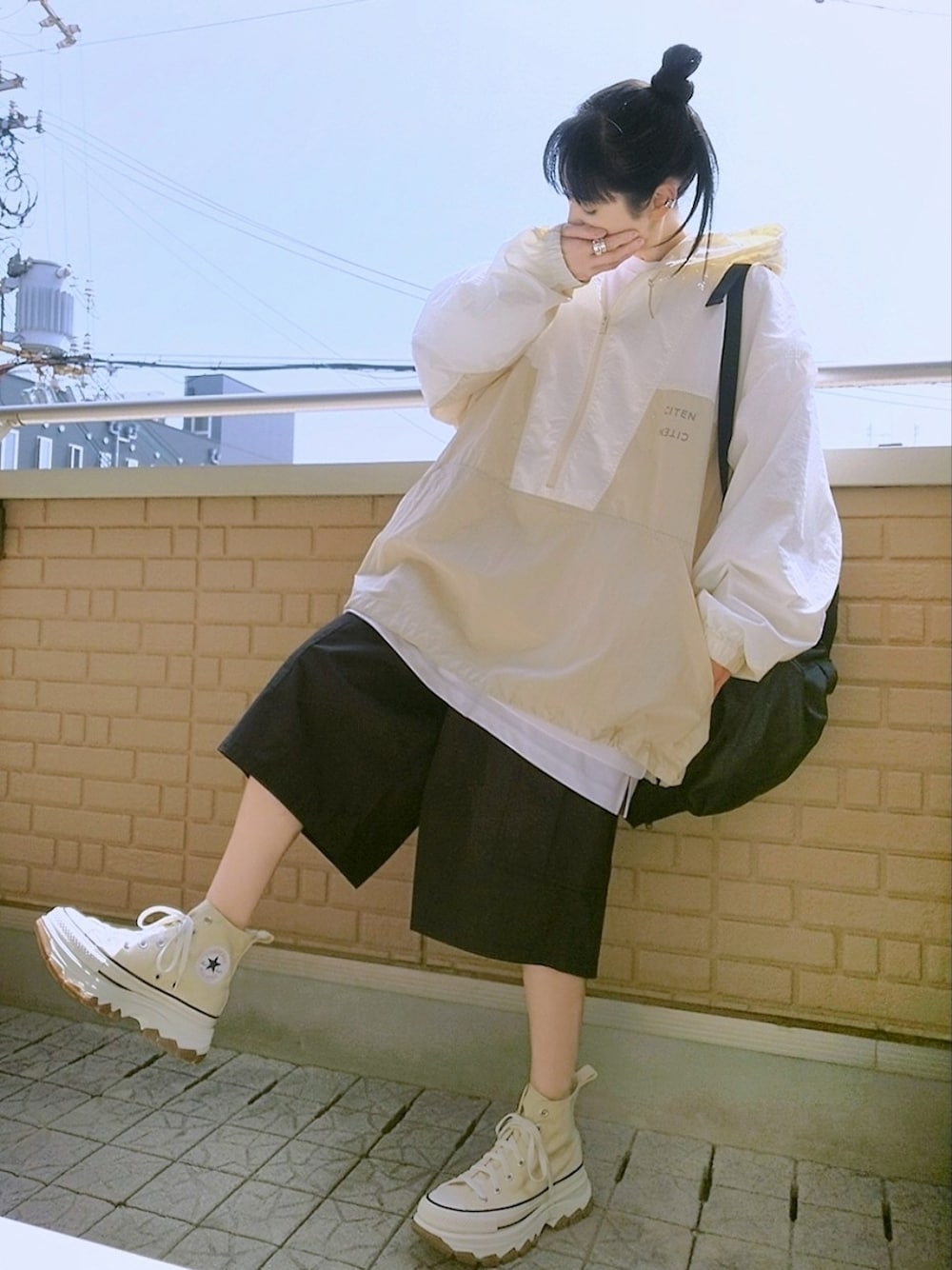 ナイロンハーフジップ×ハーフカーゴパンツ 軽くてシャカシャカ素材なナイロンハーフジップは真っ白なスウェットとレイヤードしてボリュームのあるカーゴハーフパンツはオーバーサイズでゆる感+ 全体のバランスと合わせて足元はごつめ&厚底コンバース