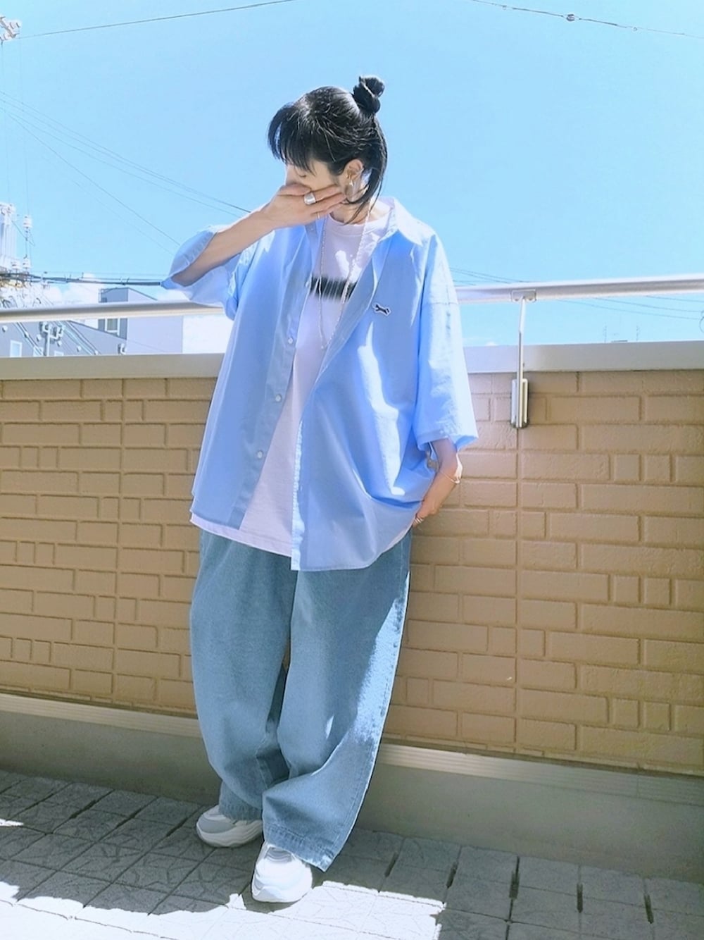 シャツ×ロゴTシャツ ゆったりだけどシルエットの良いバルーンデニムにAFEWのロゴTにルーズシルエットのビッグシャツをゆる羽織り 全体のカラーに合わせて足元も同色系の厚底スニーカー シンプルコーデなのでアクセサリーはレイヤード付け