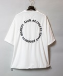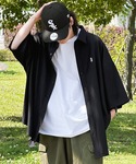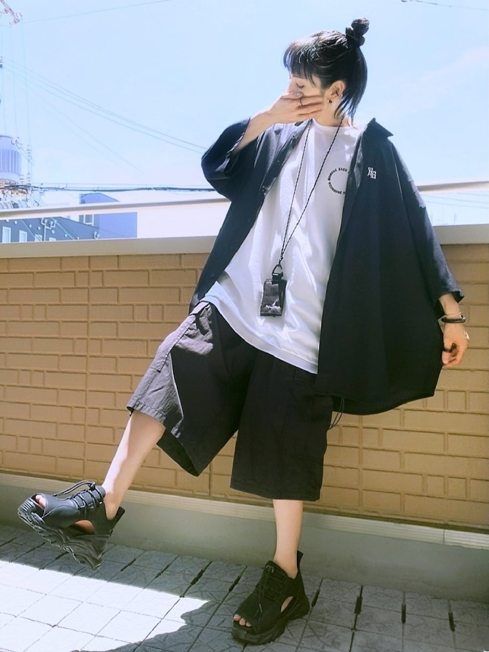 カーゴパンツ×スポーツサンダル 背中に刺繍のサークルロゴ·裾にドローコードがついた白Tにとろみのあるオーバーサイズのシャツは抜き襟でゆる羽織り ワイドなカーゴショートパンツに合わせて足元はごつめ&厚底のサンダル