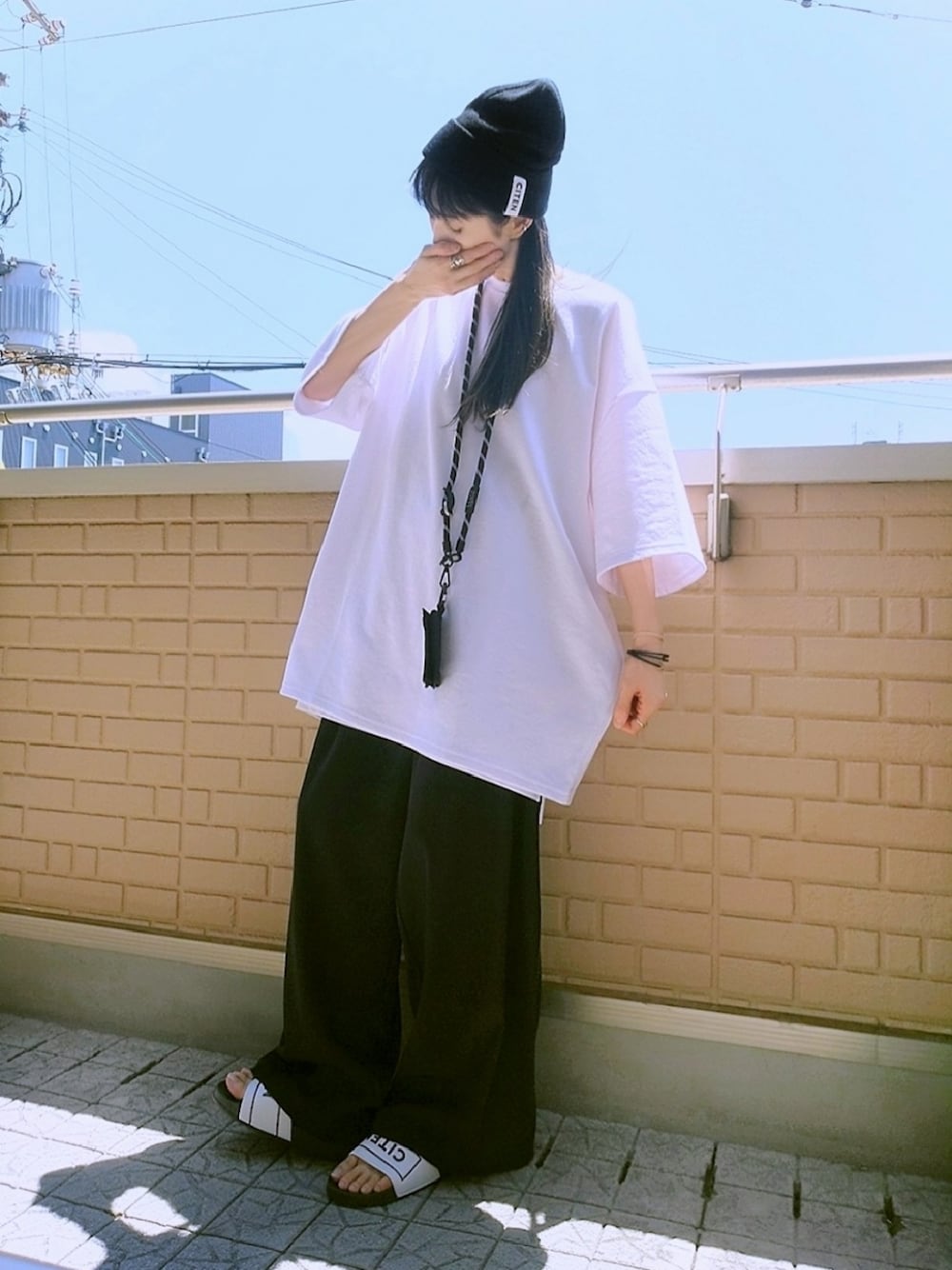 バックロゴTシャツ×ワイドパンツ シルエットの綺麗なワイドパンツはゆるラフでもきちんとした場でも履けてオールシーズンいける♪ ビッグシルエットのTシャツはチラッと白タンクとレイヤードしてビーニー+サンダル+アクセはCITEN合わせのゆるゆるラフな休日スタイル