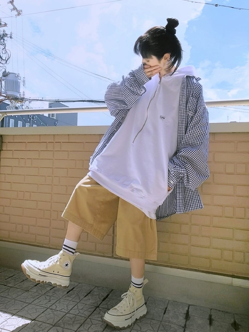 ギンガムチェックシャツ×ハーフジップパーカー ハーフチノに厚手のカットソー生地のハーフジップパーカーにA4サイズの雑誌が入るマガジンポケットが内側についたギンガムチェックのシャツを抜き襟でゆる羽織り どれだけ好きなんだカウラムw