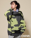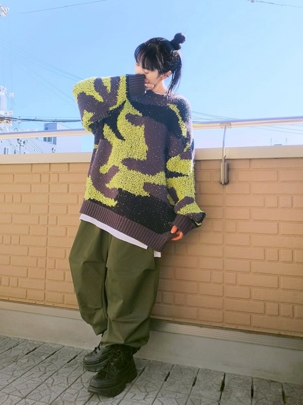 迷彩ニット×カーゴパンツ antiqua発のブランド『OWNth(オンス)』の迷彩ニットはテープ状の糸のテープヤーン(小窓)を織り込んだ異素材ニット カーキのカーゴパンツとブーツタイプの厚底コンバースと合わせてミリタリーテイストなコーデ