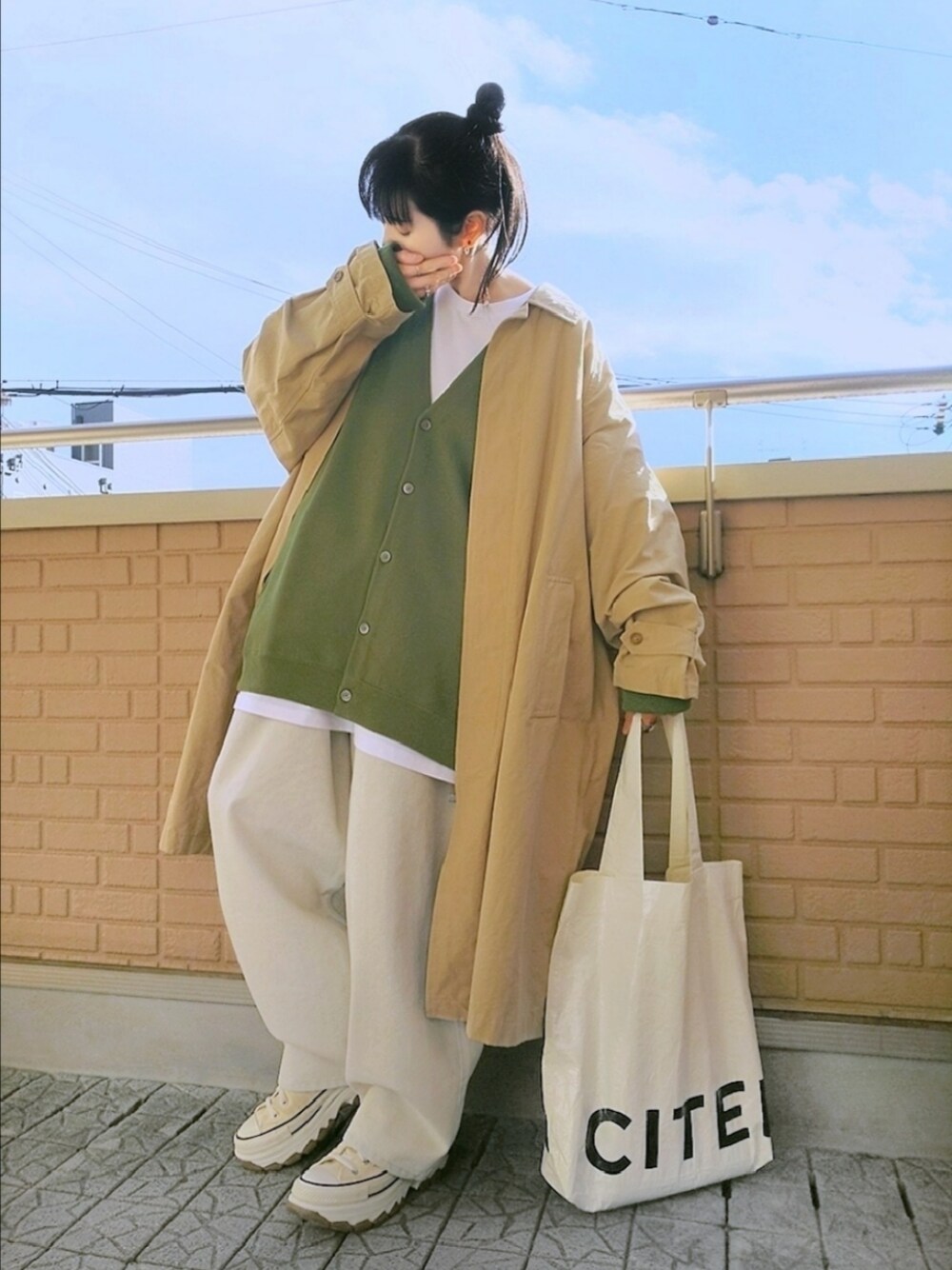 トレンチコート×カーディガン ワイドシルエットなCITENのデニムはウォッシュ加工で限りなく限りな〜〜く色を抜いたホワイトデニム ほんのチラッとしか見えてないGUのグリーンのテープベルトと同じグリーンのウォッシャブルカーデにドライポンチTをレイヤードしてトレンチコートを抜き襟でゆる羽織り CITENのトートは薄いけど頑丈で使い勝手はかなり良い♪