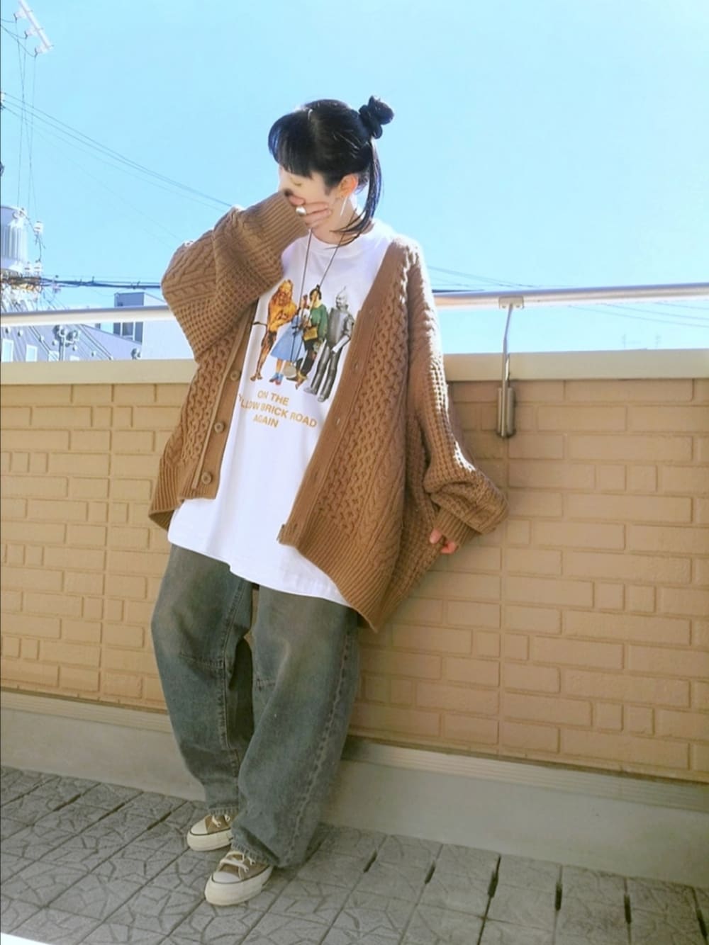 GU×UNDER COVERのコラボアイテムーオズの魔法使いTシャツは白タンクとレイヤード オーバーサイズのケーブルニットカーデほぬき襟でゆる羽織り ヴィンテージな雰囲気のあるオズTに合わせてボトムはバレルレッグ足元はブラウンのペタンコONVERSE ついでにアクセサリーもそれっぽくつや消しタイプ
