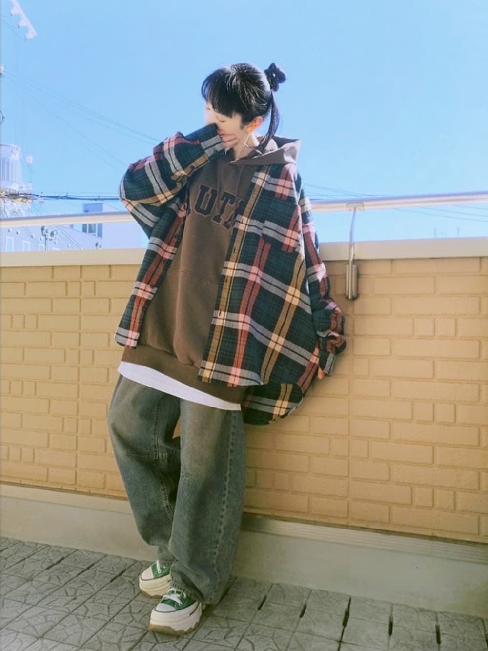 しっかり厚みのあるNAUTICA定番のロゴパーカーは白Tとレイヤードして抜き襟で大柄が可愛いチェックシャツをゆる羽織り オーバーサイズな全体に合わせて足元は厚底コンバースだけどカラーはシャツとデニムの色味に合わせてグリーンに♪