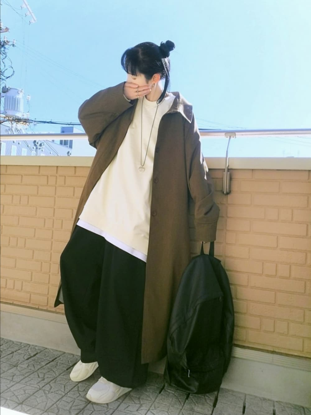 腰回りだけじゃなく裾にもタック入りのワイドパンツに速乾性があって皺になりにくいスウェットは白Tとレイヤード そして抜き襟でゆる羽織りしてるロングコートは少し重みがあるけど落ち感がよくてシルエットも良い シンプルなコーデだからアクセサリーは華奢めなものを多めに+