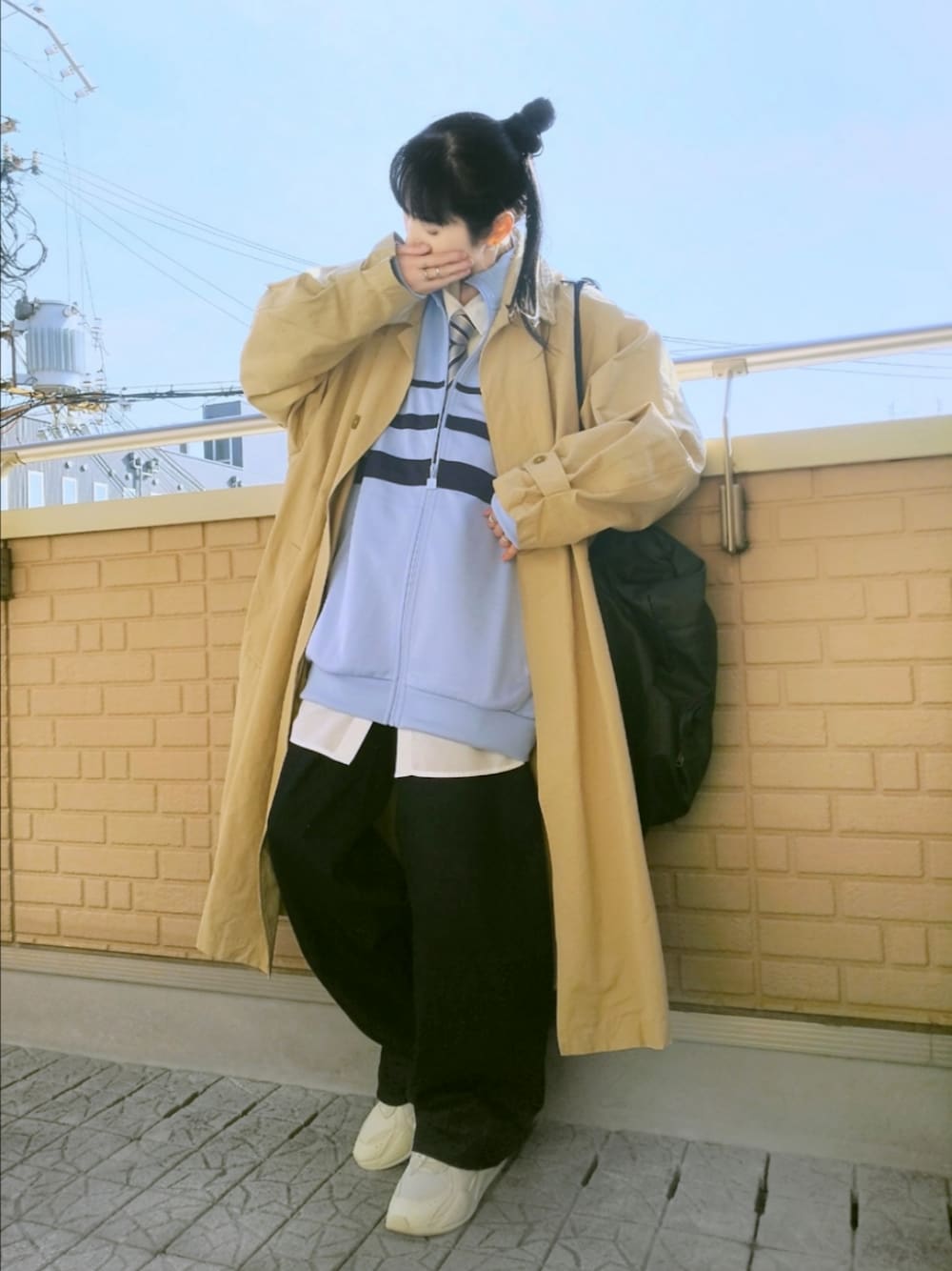 ネイビーのバレルレッグデニムにトレンチの下は春っぽいサックスブルーのadidasのトラックジャケット 白シャツをレイヤードしてネクタイをプラスしてプレッピースタイルでスポーツミックス