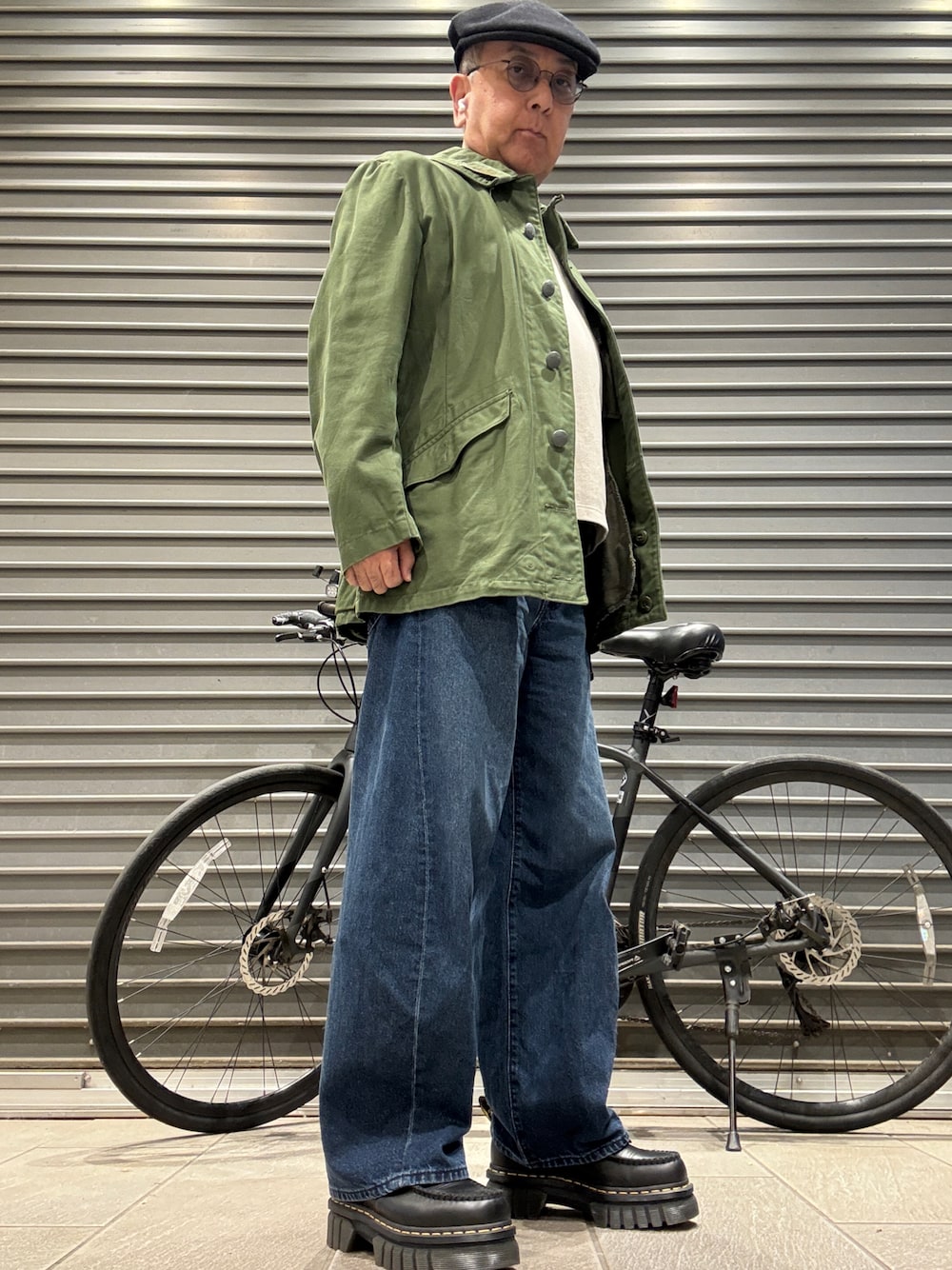 サクッと羽織れるミリタリージャケットはデニムとの相性抜群。 足元は厚底タッセルローファーで引き締めてみました。 (自転車は関係ありません)
