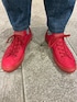 オールドユニクロのシングルトレンチコート(ラムレザー)と太デニムを使ったコーデです。 赤いスニーカーはコンバース オールスターのラバー製防水仕様。レインシューズとして使っているのですが、あまり頑丈な作りではないので、穴が開かないか気になっています。