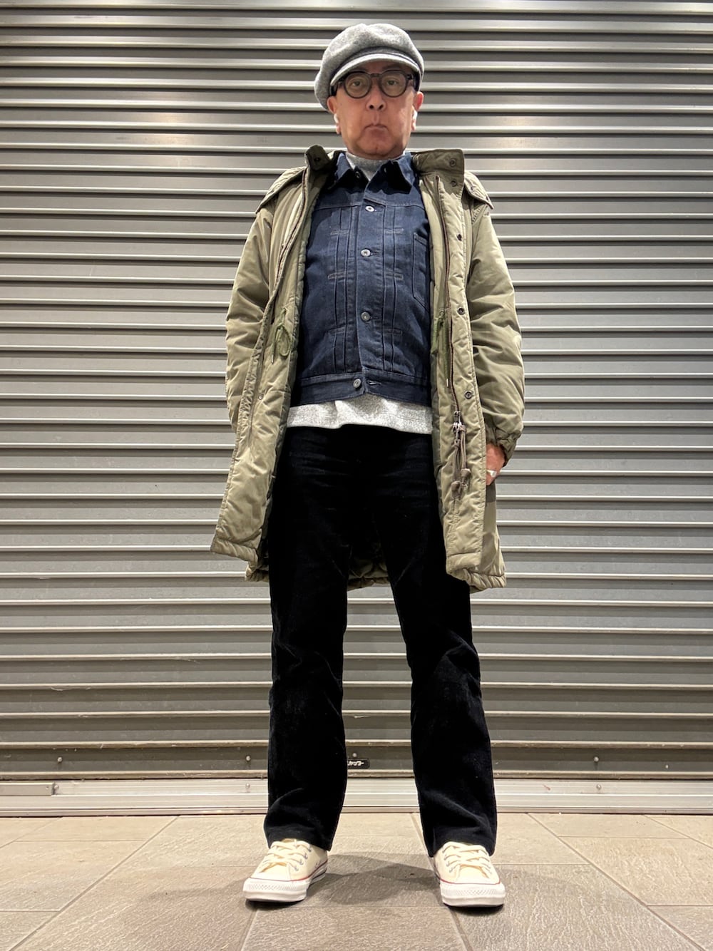 ユニクロの新商品デニムトラッカージャケットを使ったコーデです。 Levi’s の「大戦モデル」と呼ばれるジャケットに似ていると話題になっているのと、一部店舗のみで扱っている商品のため、すぐに完売したアイテムですが、僕はオンラインで購入しました。 購入したのはMサイズ。ユニクロの従来品デニムジャケットのLサイズを持っているのですが、重ねてみたところ肩幅・着丈・袖丈ともほとんど同じくらいでした。 ポケットは左胸のかなり低い位置に1個。あと、サイドポケットが両脇の目立たない位置についています(写真2枚目)。リーバイスの「大戦モデル」にはサイドポケットがありませんが、これはあった方が断然便利ですね。 (写真3枚目)背中側にタックが2箇所。そしてシンチバック(身幅調整用のベルト)が付いていて、ちょっとレトロな感じのデザインになっています。 あと、袖のあたりに大きなシワみたいな影が写ってますが、これは写真撮影時の僕の不注意によるミスで、袖を引っ張れば解消します。(直前まで上にコートを着ていたため気付かなかったんです。) 素材は綿100%で触ると柔らかな感触。伸縮性はありません。(従来品は綿99%、ポリエステル1%で少しだけ伸縮性がありました。) デニム1枚のみで裏地も中綿もありませんから、防寒性能はほとんどなくて、真冬のアウターとしては適していません。そのため、今回はインナーとして着用し、上にモッズコートを着込んでちょうどいいくらいでした。 余談ですが、今回履いているLevi’s のコーデュロイパンツは古着なんですが、なんと日本製なんですよ。珍しいよね。
