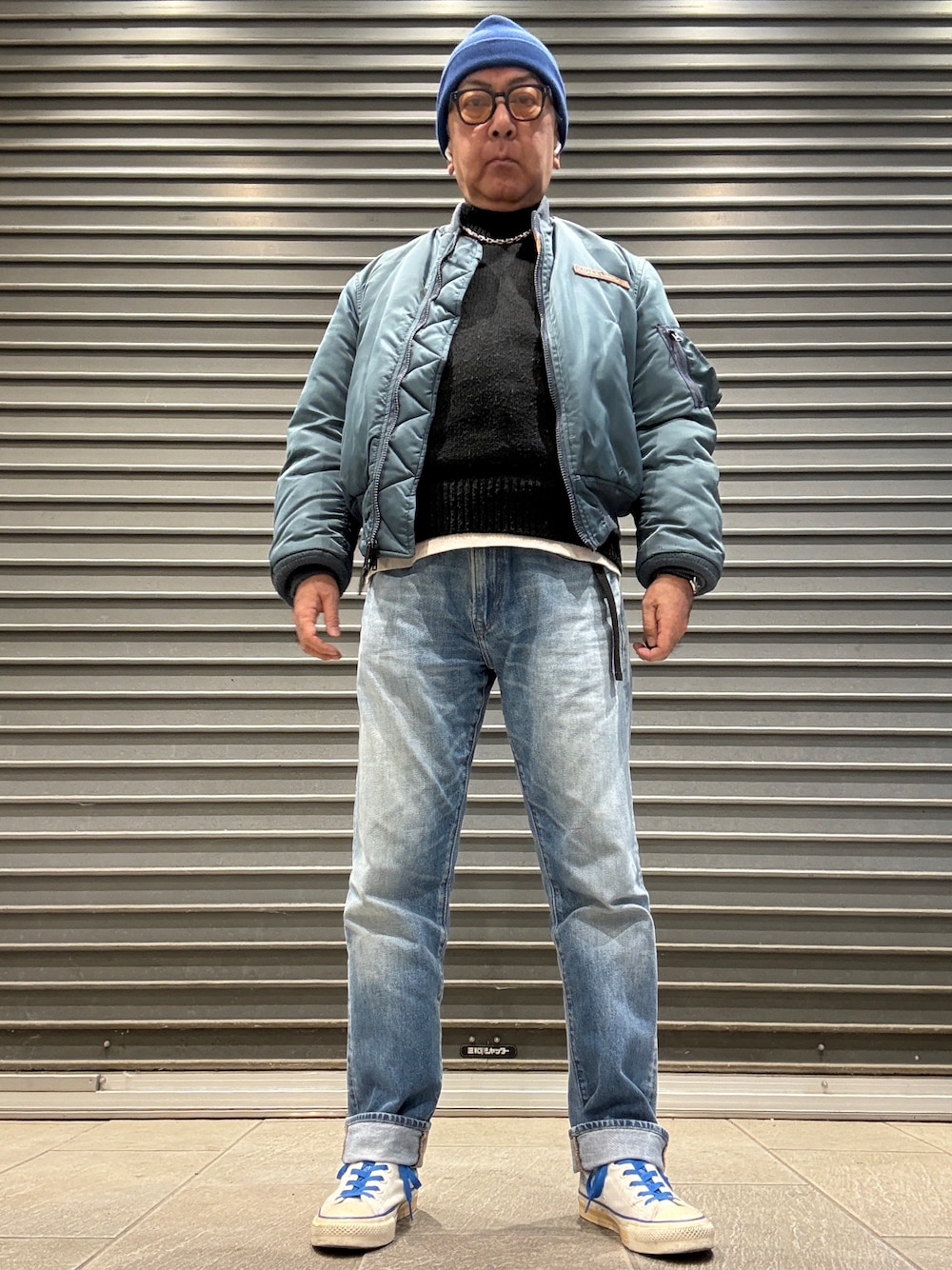 朝から降っていた雨は昼過ぎには上がって、だんだん空が明るくなってきました。 今日のコンバース オールスターは日清食品とのコラボ。「シーフードヌードル」のパッケージデザインを大胆に取り入れたスニーカーです。そのアクセントカラーのブルーに合わせて、青いビーニーを使ったコーデを組んでみました。