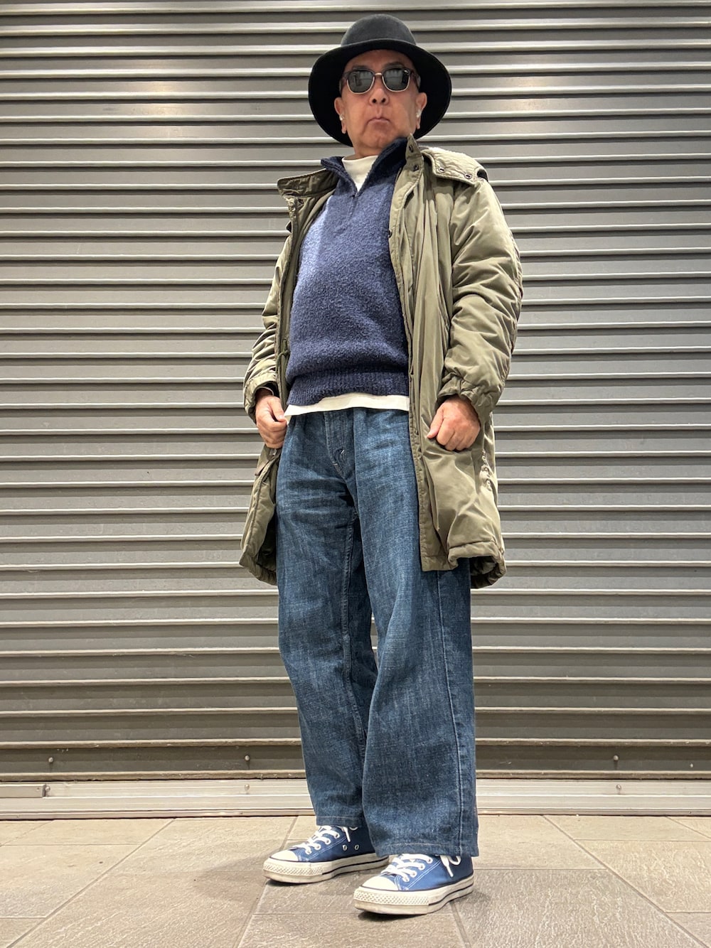 モッズコートと Levi’s 569 ルースストレートデニムを使ったコーデです。 スニーカーは CONVERSE ALL STAR メイド・イン・ジャパンのハイカット。スリムなデザインのアッパーですが、自分の好みより細く感じたので、シューレースを一回り太いもの(8mm幅)に交換してボリューム感を出しています。