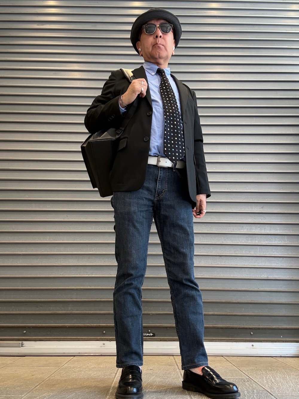 黒っぽいアイテムを中心に。明るい色でアクセントを。 コインローファーは何にでも合わせられる万能シューズですね。