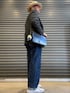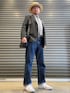 テーラードジャケットとデニムパンツのコーデが続きます。 グレーのジャケットに同色のシャツ、ナロータイの組合せ。帽子は明るい雰囲気のカンカン帽を被ります。 足元も明るくしたくて、ジャーマントレーナーを履いてみました。