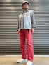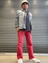 デニムベストは両袖がカットオフ。全体にダメージ加工が施されています。特に、左胸の大きな穴のところには裏側からスタッズが縫い付けられています。(写真③) 真っ赤なカラーデニムは古着だけど、ばっちりジャストサイズ。白のコンバースとの組み合わせはお気に入りです。