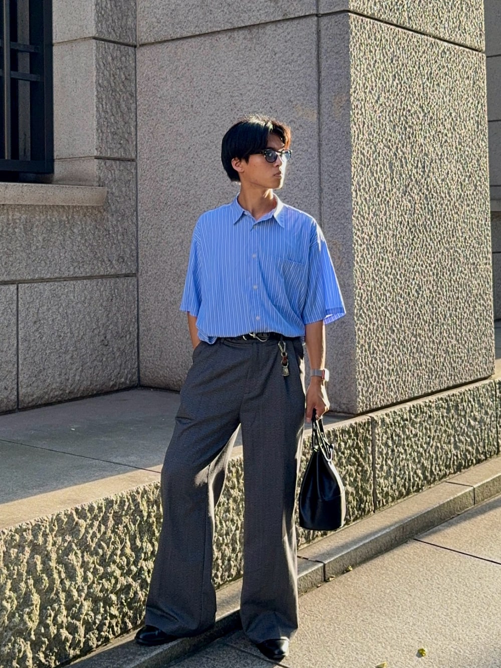 投稿見ていただきありがとうございます🙌 今回はストライプシャツを使った爽やか夏コーデ☀️ この日はグレーのスラックスと合わせて韓国風に🇰🇷 この組み合わせ個人的にはかなりお気に入りでみんなにもおすすめしたいコーデです👍 西陽が眩しすぎたため、かなり表情渋ってます。笑 小物類は全て合わせやすい革製のアイテム使ってます👜👞 いいね、お気に入りして参考にしてみてね✅ 他のコーデはインスタにて▶︎iii___kamma