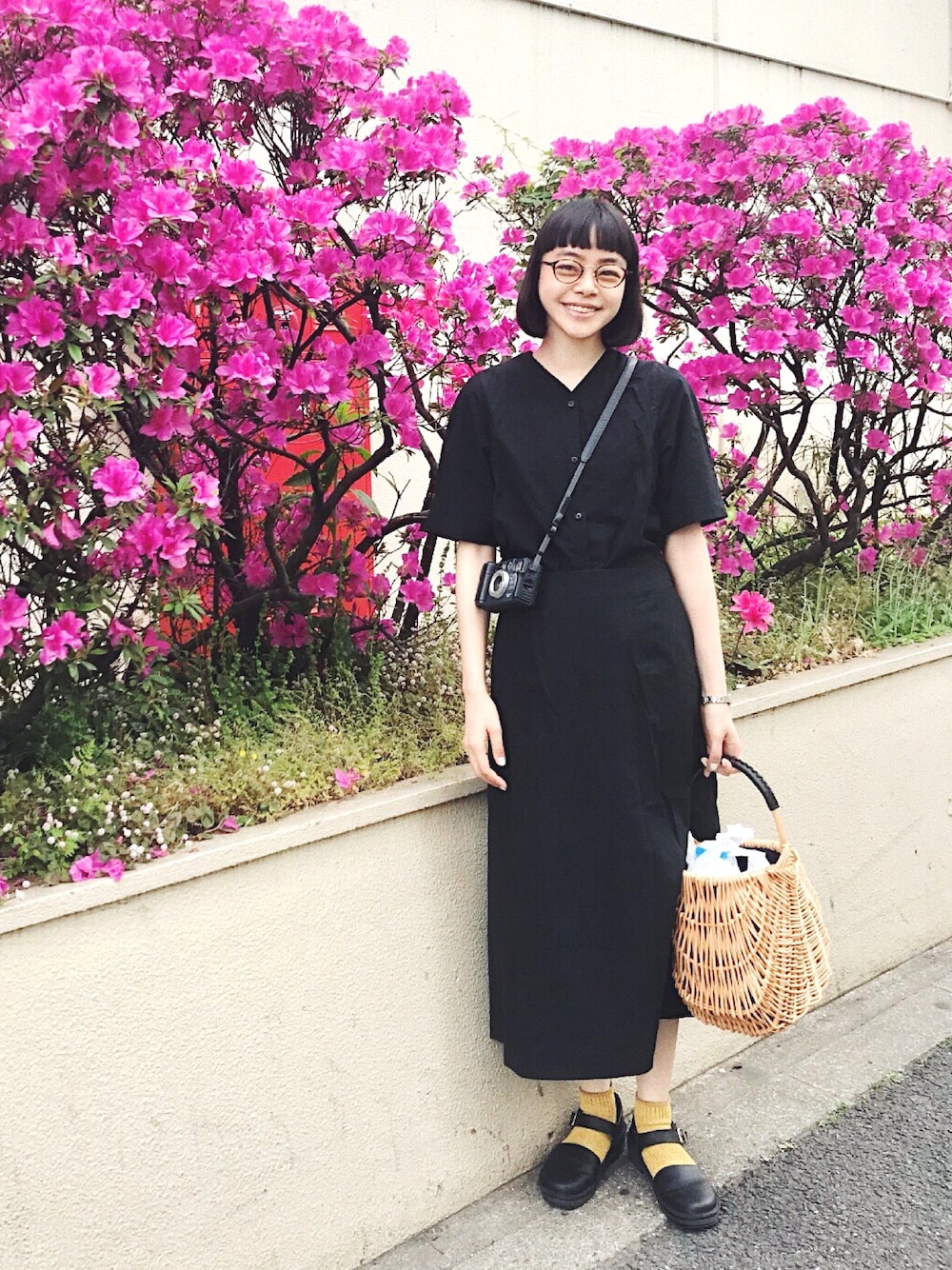 ツツジをバックに。 THE HINOKIのワンピース。 靴下はポンテデピエのもの。 黄色は子供っぽい色だから黒と合わせるといいよって、 スタイリストさんからの助言を聞いて即実行する。