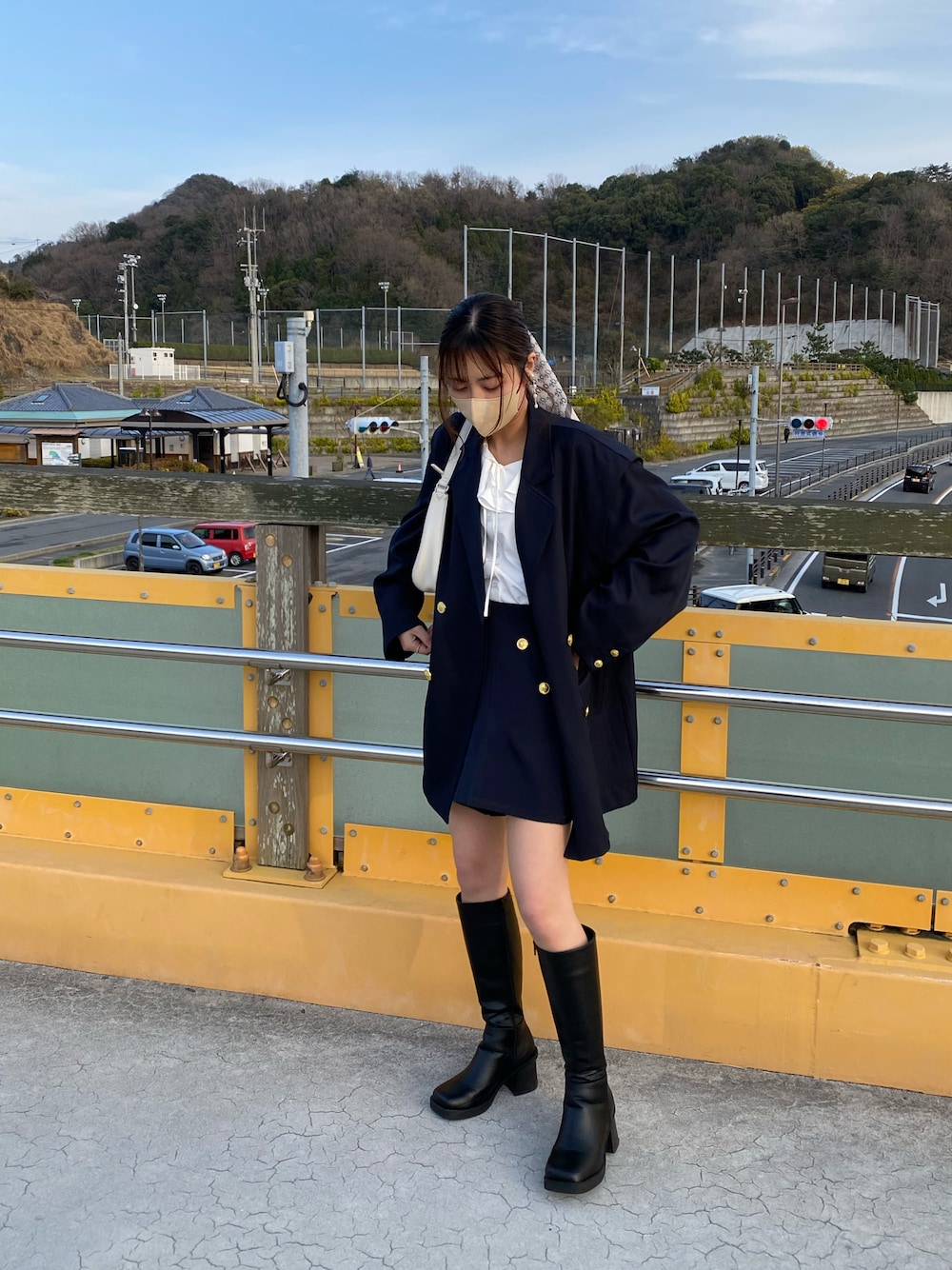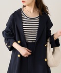 紺のジャケットずっとほしくて 袖が外せて春から夏にかけて着れる~ チコのセットアップかわいい🐶 モノグラムのスカーフもかわいくて 甘めコーデにしてみました❕