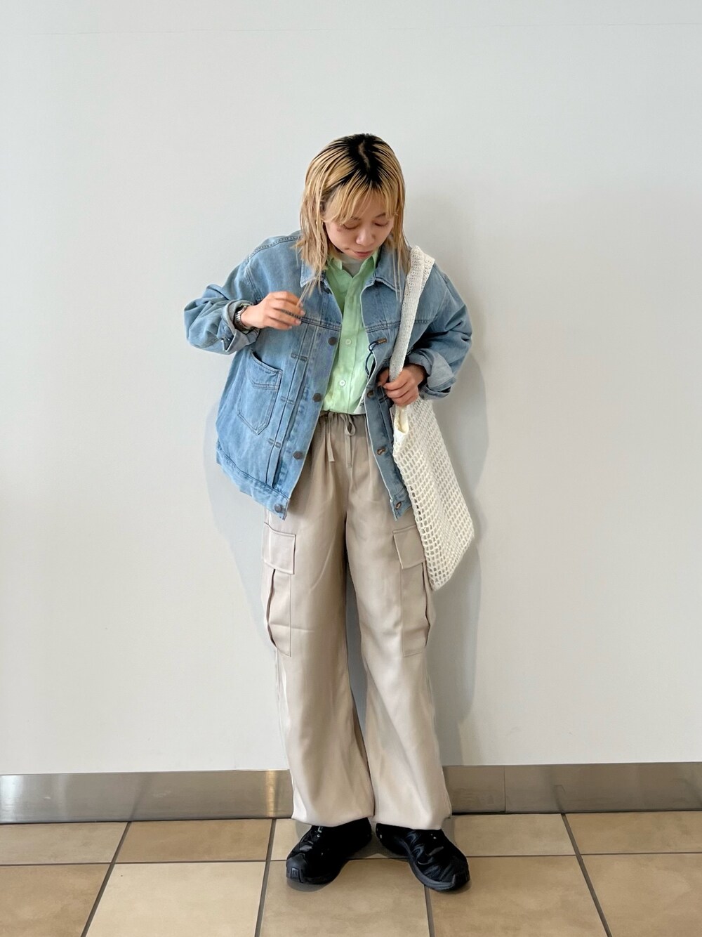 春らしい柔らかいカラーで合わせたコーデ✨ つやっとしたサテン素材のパンツは メンズっぽくなりすぎず、履き心地も抜群です◎