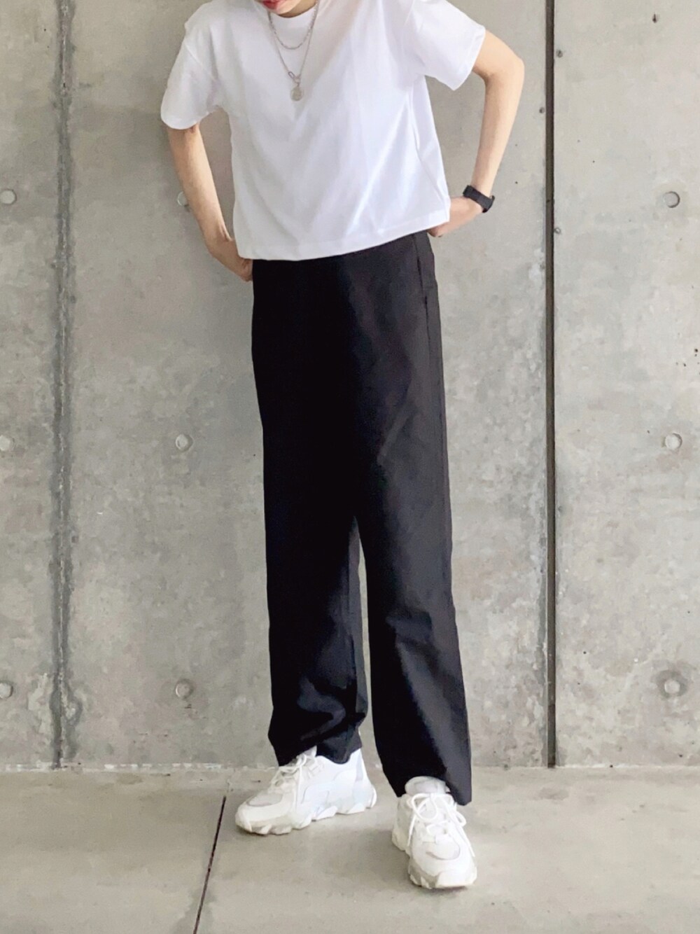 シンプルコーデ🐼 このパンツ好きで2色め いつものサイズだと少しゆるく感じたのでワンサイズ下でもいいかも💭 \\ item // tops:UNIQLO ドライEXクロップドT Sサイズ bottoms:UNIQLO リネンブレンドリラックスストレートパンツ Sサイズ shoes:GRL クリアソールダッドスニーカー