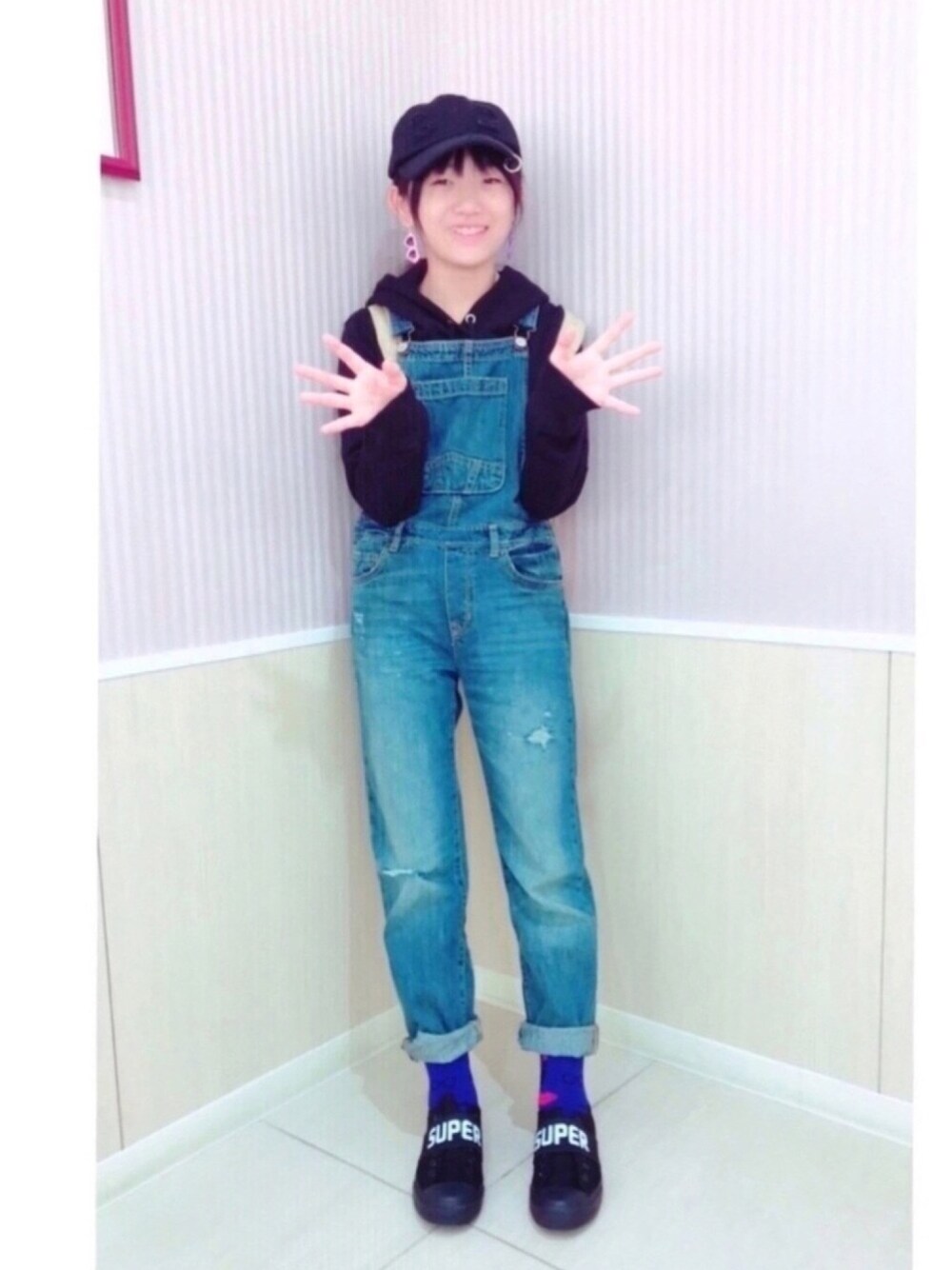 娘ちゃんのブラック★コーデだよ! シンプルの中にワンポイントで 少しは洒落て見えるかな⁈ 初❤︎イヤリング❤︎デビュー❗️ プチプラの靴下に注目(笑) くちびる💋柄は…なんとダイソーだよ★ 色柄が、めっちゃ可愛いかったので💋 オール#プチプラ だよ(笑)