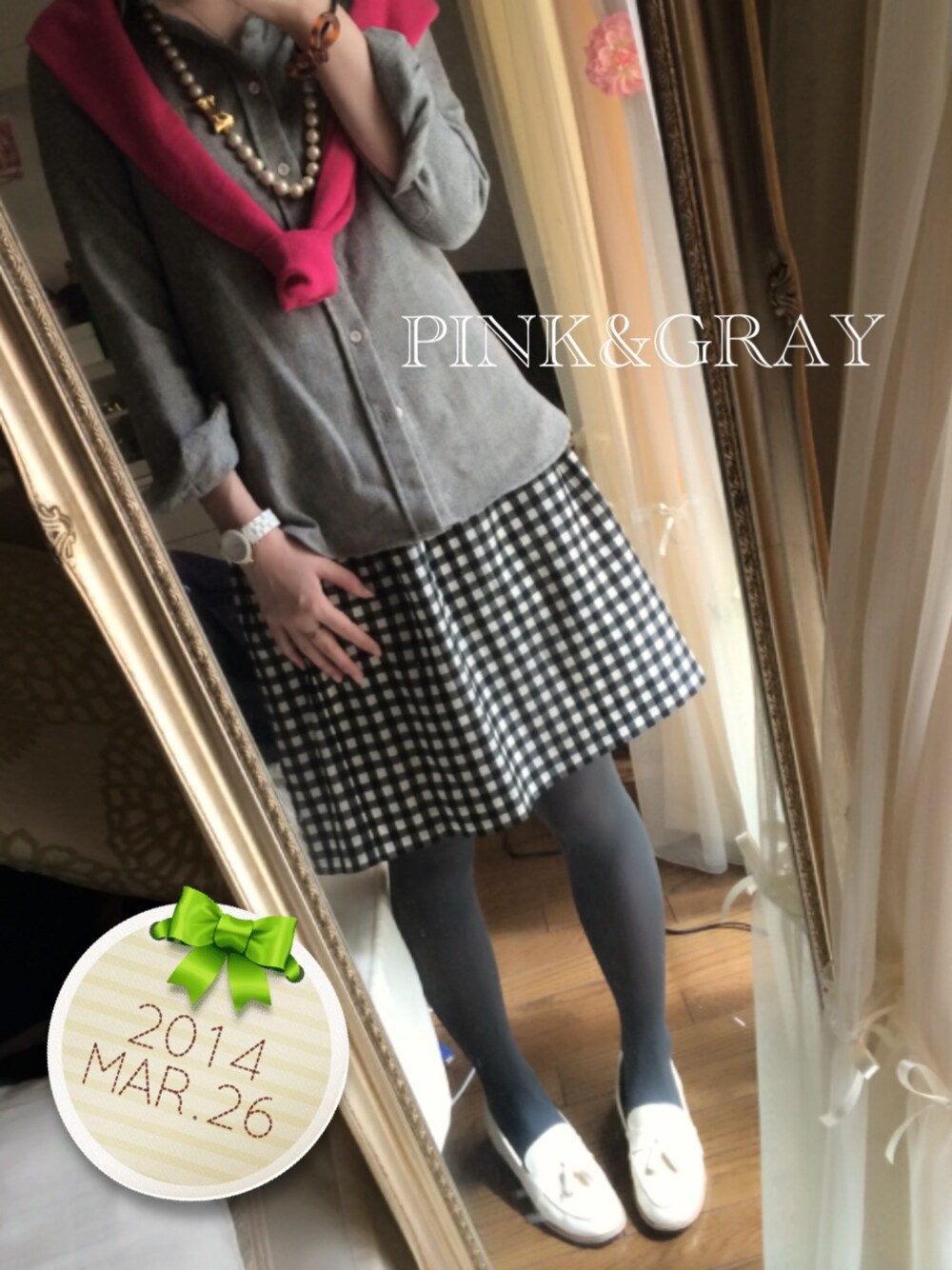 グレーをベースに、ビビッドピンクのカーディガンをアクセントにしました。小物は白で統一。シャツがツイード調なので、1枚でも肌寒くない厚み。