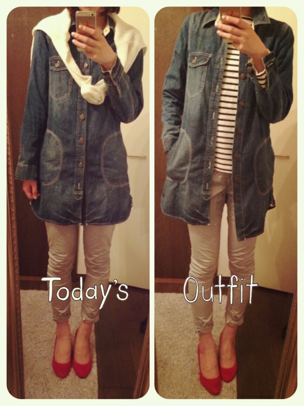 ボーダーデニム大好き!シルバーパンツに鮮やかなピンクを差し色にしたくて。