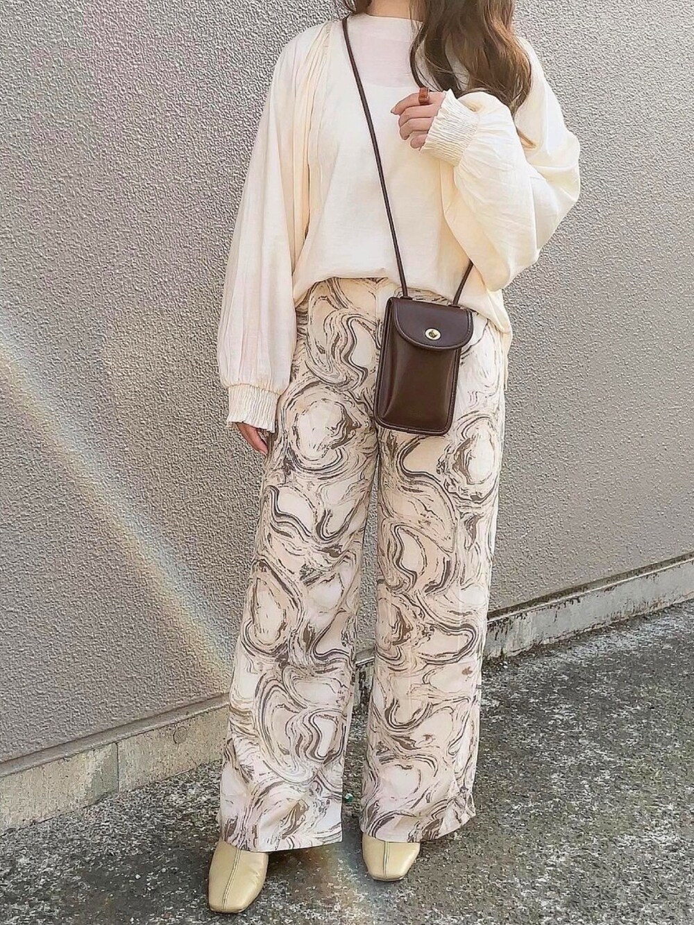 【 𝑜𝑜𝑡𝑑 】 bab.showroom 🏷 𝑚𝑎𝑟𝑏𝑙𝑒 𝑝𝑎𝑛𝑡𝑠 マーブルパンツをポイントにした ワントーンコーデの日🍨 マーブル柄がほんと可愛い〰︎♡ やわらかい生地で履き心地も最高✌🏻