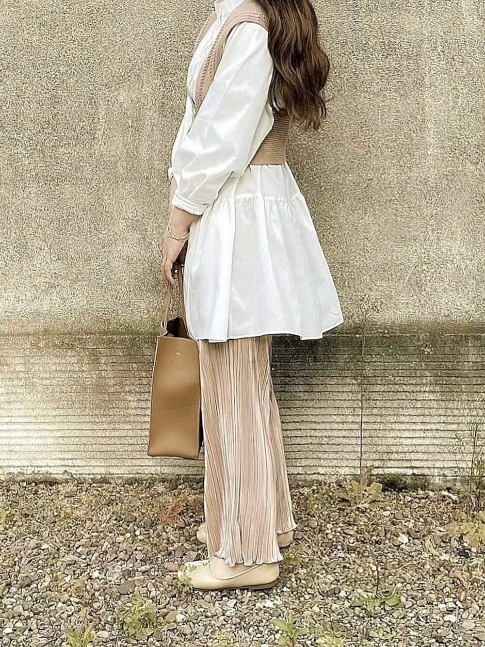 【 𝑏𝑙𝑜𝑢𝑠𝑒 𝑐𝑜𝑑𝑒 】 ブラウス1枚でちょうど良い季節🌼 babの裾ティアードバンドカラーブラウスに guのビスチェ&パンツを合わせた日🦢 ふわっとした横からのシルエットが好きなブラウス♡
