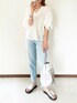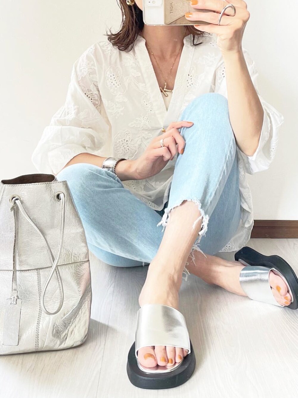 白×デニムのシンプルコーデに映えるシルバーサンダル🤍 今っぽいデザインで、クッション性あるから履き心地も良きです💕