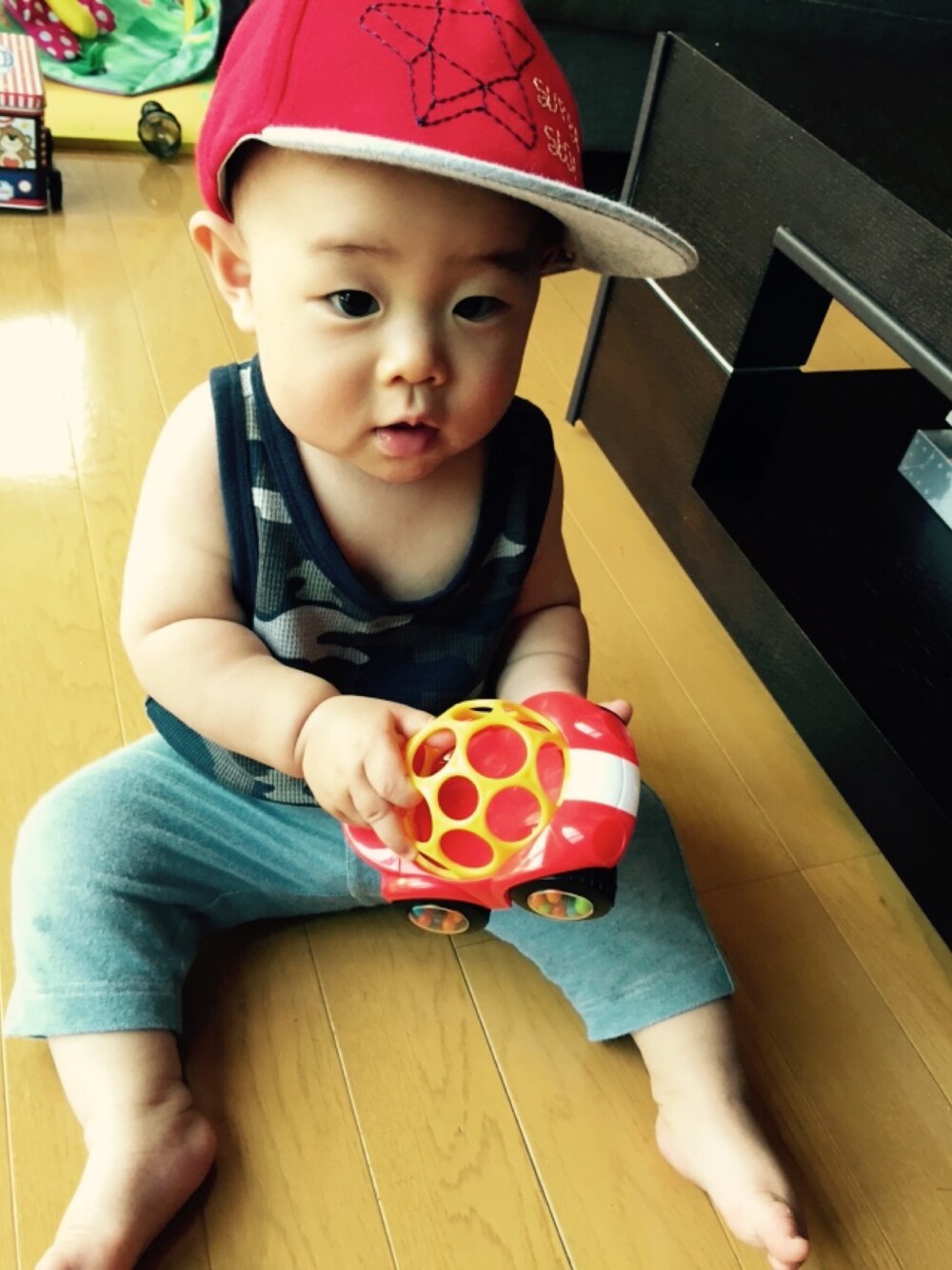 今日は、暑い〜! 蒸し暑いからめっちゃ目についたもの着させた楽コーデ! キャップと車のおもちゃが合ってるな笑 最近はラッパ吹くの上手になったり、口をとがらせてブブブーと言うようになりました♡