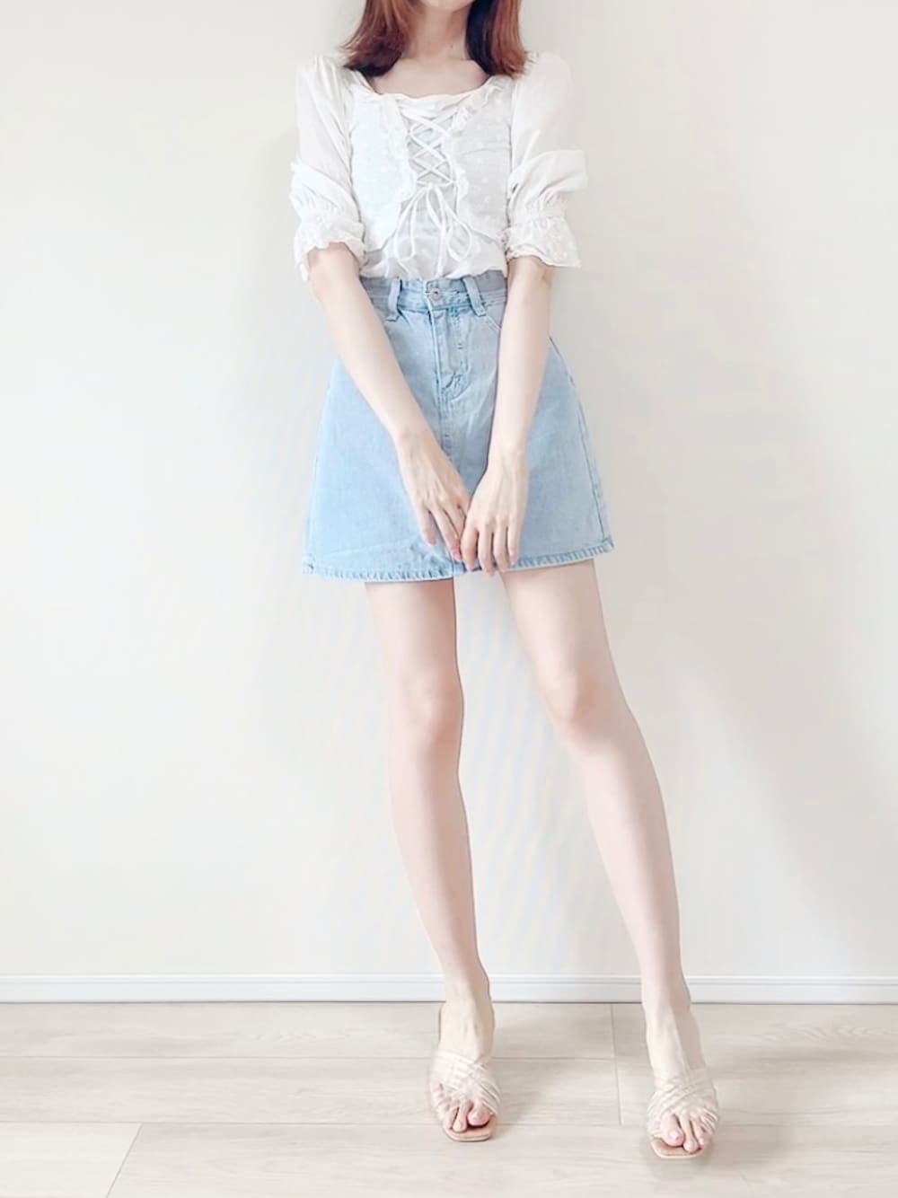 撮り溜め夏コーデシリーズ🤫☀️ フリルブラウスに デニムスカートで甘さを抑えた カジュアルミックスコーデ