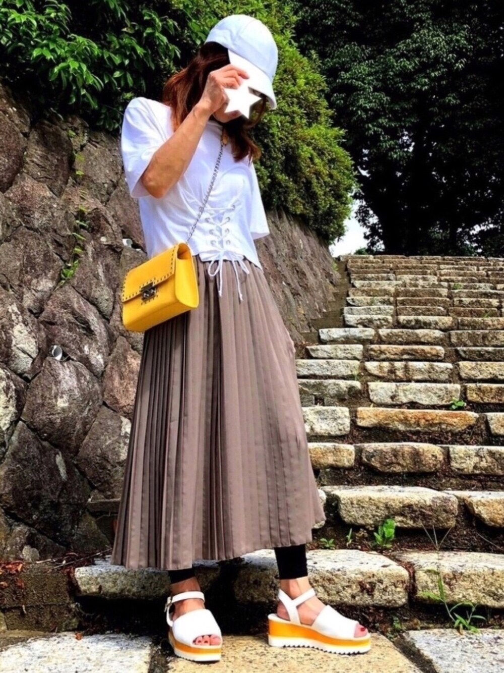 プリーツスカートの着回しコーデ アースカラーの落ち着いた色のスカートなので、 ZARAのTシャツと小物でホワイトを多めに取り入れ、 夏の暑さを感じさせない爽やかで、 スポーティなコーデに🌴🍉 差し色のイエローでさらに元気な印象に🌻🌻🌻