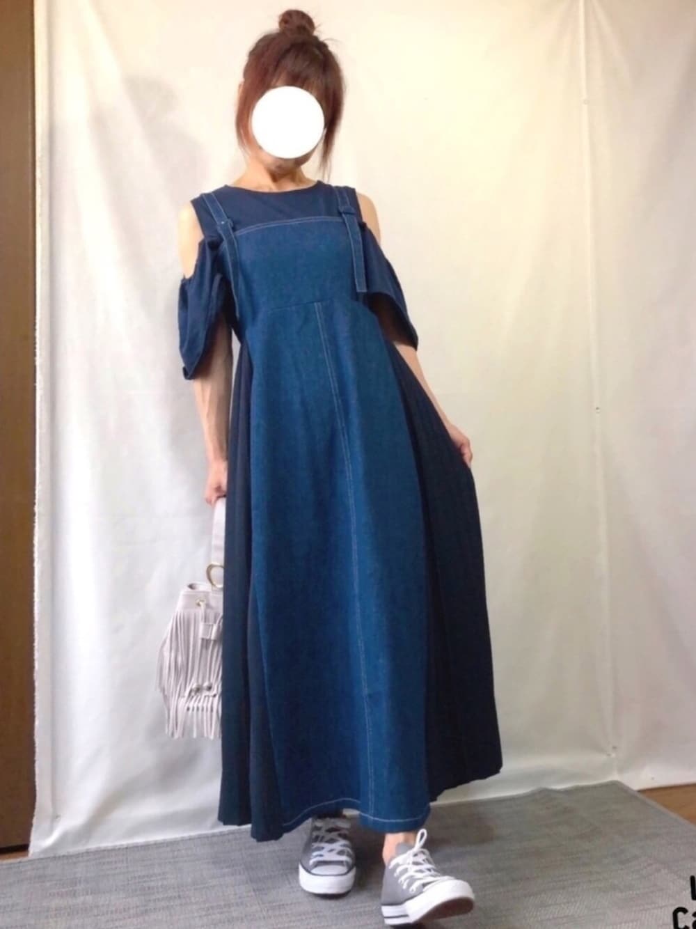 ネイビーのワントーンコーデ💙 デニムのジャンスカに 敢えてネイビーのオフショルダーを 合わせてみました。 ワンピースに見えるかな? ご覧いただきありがとうございます🙇🏻♀️