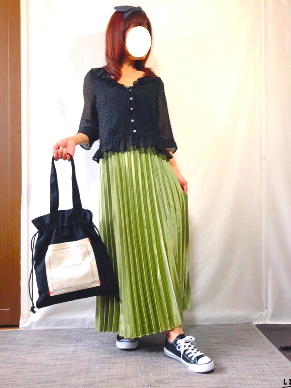 サテンプリーツスカートを使った オトナカジュアルコーデ🍀 トップスはまたブラック💦 ZARAのドットブラウスです🎶 サテンスカートがインパクトあるので 他はブラックでまとめました。 隠れポイントはカチューシャ🎀 a.v.v.のKIDS用のチャコールグレー✌️ ご覧いただきありがとうございます🙇🏻♀️ 前回の投稿にフォルダインありがとう ございました🎶 とっても嬉しいです🥰