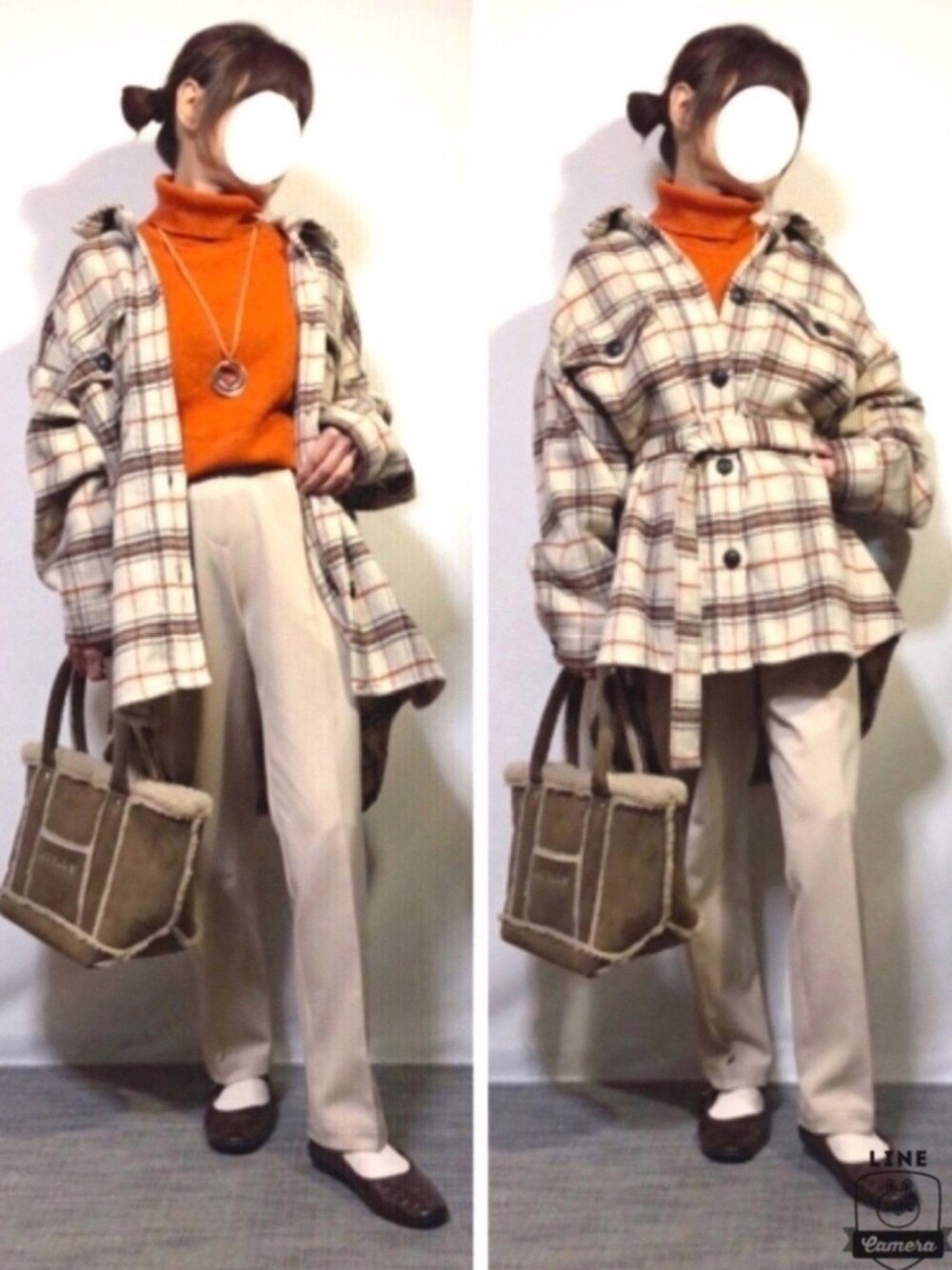 CPOジャケットのコーデ♡ 2パターン撮りました🎶 今季初のCPOジャケット🧥 ブラウンXオレンジXベージュの チェックCPOに合わせる タートルネックセーターを 引出しの奥に発見‼️ あるではないか❣️ 大好きなオレンジ色🍊 わーい🙌CPOにナイスアイテム🎶 #着れてない服着ようプロジェクトに ピッタリなアイテム❣️ 私の推しブランド→Re:EDIT チビーズ向けのサイズがあるので お勧めです。 今回は、アイボリーのテーパードパンツ ジャストサイズでうれしい😊 閲覧ありがとうございました🙇🏻♀️ ケンさん❤️ ちょきさんさん❤️ chicoちゃん❤️ りゅっくちゃん❤️ ひろっちゃさん❤️ 前回の投稿に📁インありがとう ございました🎶❤️ とっても可愛くてです🥰