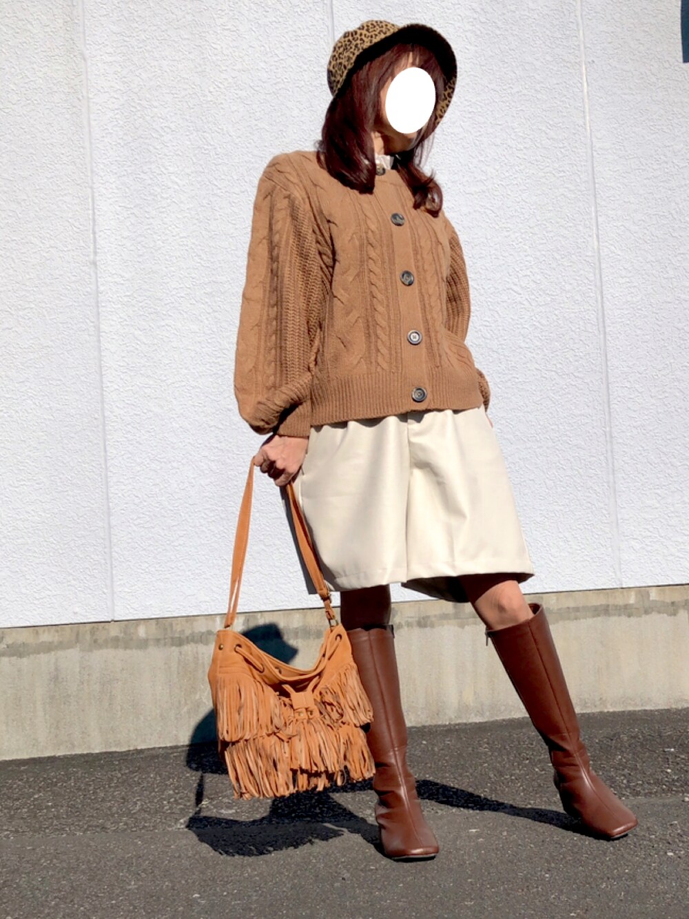 いつもご覧いただきありがとうございます🙇♀️ いいね❤️お気に入り➕ステキな📁インも 感謝の気持ちでいっぱいです❣️ 🐣🐥🐣🐥🐣🐥🐣🐥🐣🐥🐣🐥🐣 今回は エコレザーパンツの着回しコーデ♡ ✨レオパード柄のバケットハット ✨ケーブルニットカーディガン ✨つけ襟 ✨エコレザーショートパンツ ✨ロングブーツ ✨フリンジショルダーバッグ パンツ以外ブラウン系でまとめた オトナカジュアルコーデ🤎