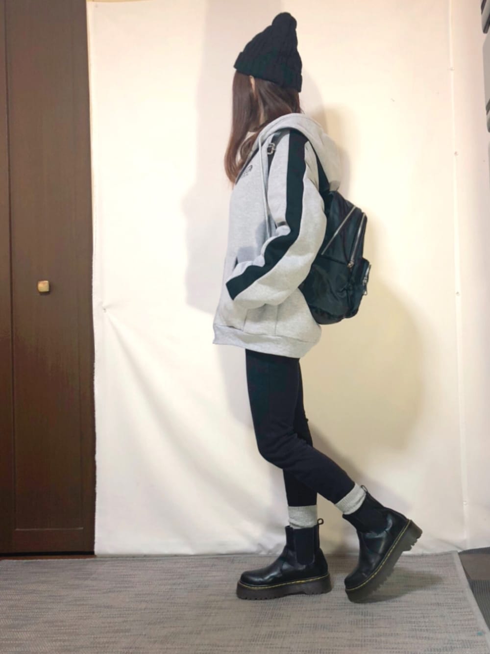 いつもご覧いただきありがとうございます🙇♀️ いいね❤️お気に入り➕ステキな📁インも 感謝の気持ちでいっぱいです❣️ 🐣🐥🐣🐥🐣🐥🐣🐥🐣🐥🐣🐥🐣 今日は ワンマイルコーデ♡ モノトーン&カジュアル ✨ニット帽 ✨裏起毛ラインパーカー ✨黒スウェット ✨ウルトラストレッチヒートテックレギパン ✨ヒートテック靴下 ✨サイドゴアブーツ ✨リュック ヒートテック重ね着してまーす👌😄