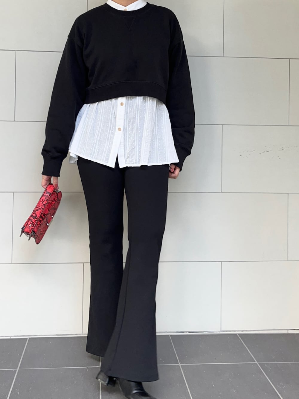 ショート丈スウェットにレースシャツをレイヤード♡ こうするとウエスト位置が上がって見えて、 脚長効果大!!