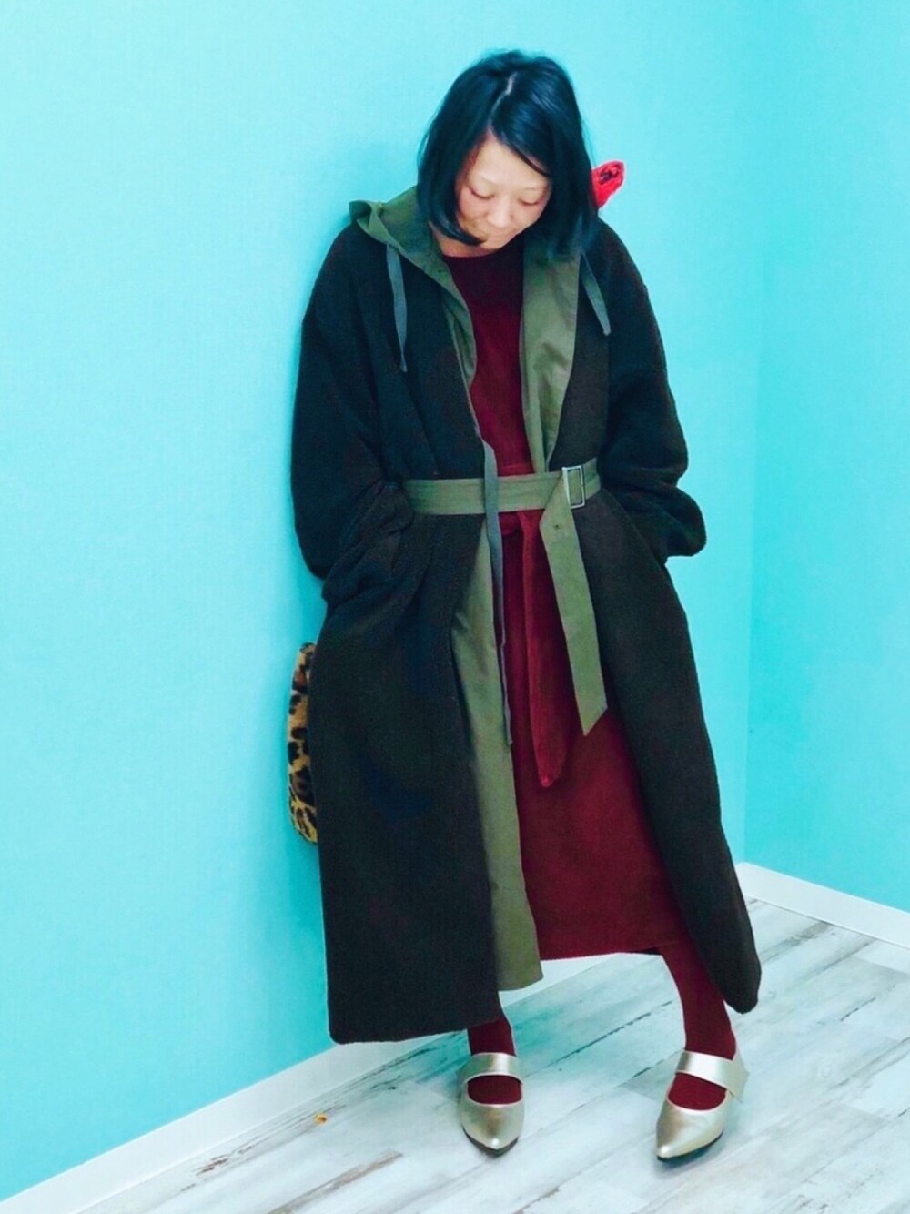 着回しチャレンジ3つめ!!! ワンピースもタイツもエンジ色❤️ お気に入りのCLANEのコートのベルトをしめてみた♫ パンツスタイルもやりたかったけど、他のアウターも着たいし。。。悩み中〜🌀
