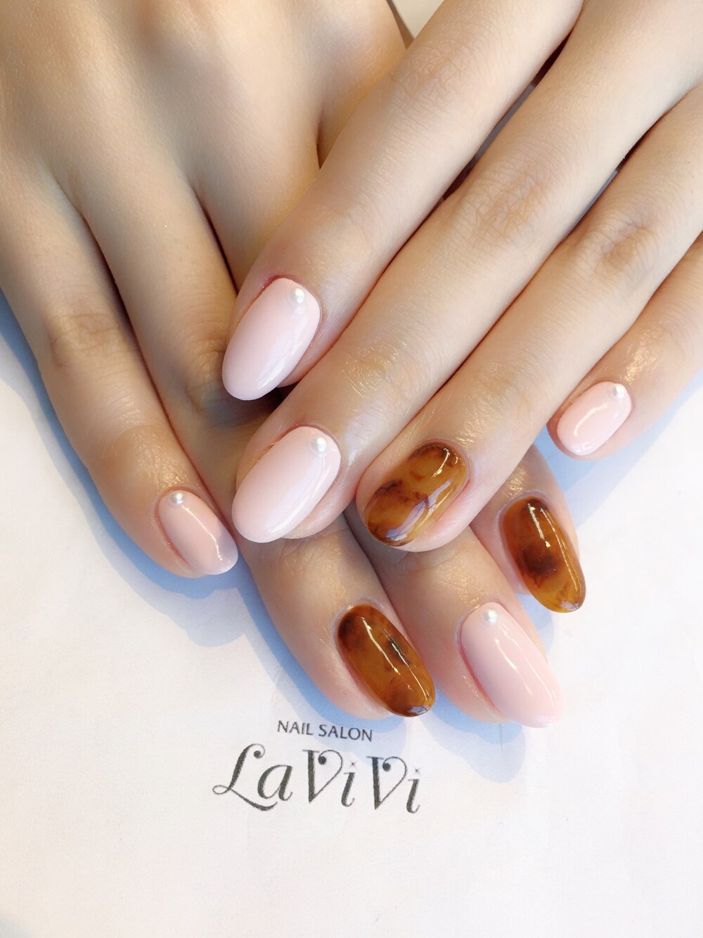 今年流行ってるべっ甲柄を取り入れ、さくらピンクでバランスよく仕上がり☆ 小粒なパールで女性らしさを足して、オフィス向けに❤︎