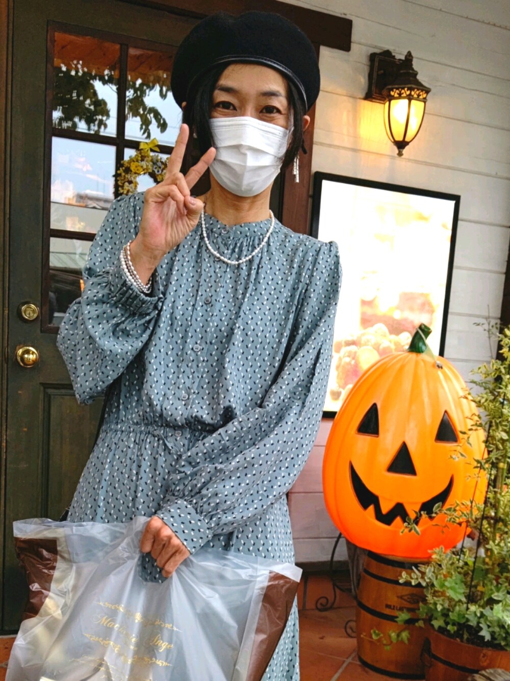 秋といえば、ハロウィン🎃✨ 毎年、町全体で仮装して歩くハロウィンイベントやってましたが、この2年間は中止💧 近所のケーキ屋さんで🎃を見つけ、 思わずパシャリ📷️ 今日はお気に入りのワンピースに、ベレー被りました。 くすみグリーンの幾何学柄がレトロ可愛い。 パールアクセでクラッシックに💖